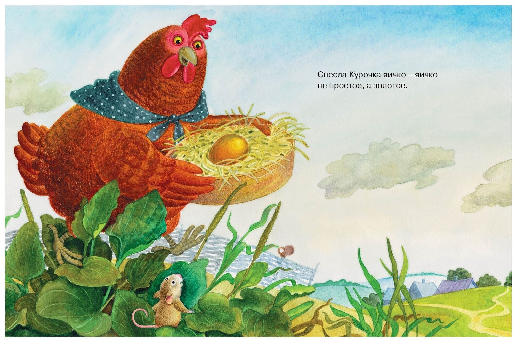 Книга супер, по 100 раз перечитываю ребенку он в восторге, очень уж ему нравится и слушать и рассматривать яркие картинки. Текст написан хорошо не мелкий. Книжечка маленькая но очень удобная, удобно держать в руке. Сказка не переделана всё как и раньше. Иногда в интернете ищешь сказку, а там 100 таких же курочек но все разные печально что переделывают, ранешное мне больше нравилось.