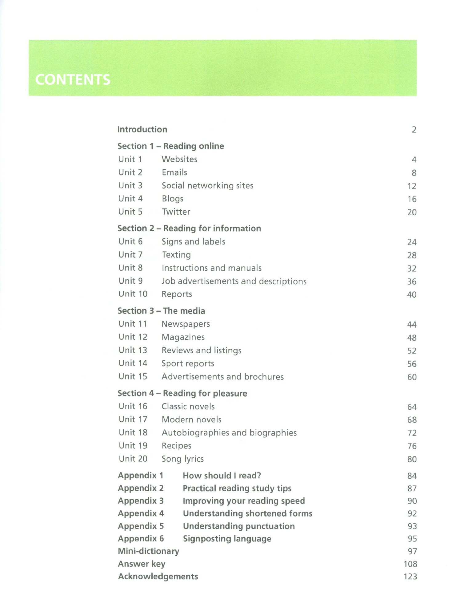 Do you understand everything you read in English?To read fluently in all situations you need to practise reading different kinds of texts.Collins Reading presents 20 different texts with exercises to help you develop the skills to read anything you come across.Reading features authentic texts and a wide variety of styles to help you develop your reading skills, such as reading for general understanding and reading for detail.Featured texts include:• signs and labels• advertisements• newspapers• brochures• recipes• classic and modern novels• social networking sites• blogs.Collins Reading is part of the new English for Life series and uses authentic material from the Collins Corpus, the world’s largest database of the English language. It is suitable for self-study and classroom use, and can help towards Cambridge FCE preparation. Suitable for Intermediate learners of English (CEF level B1+).