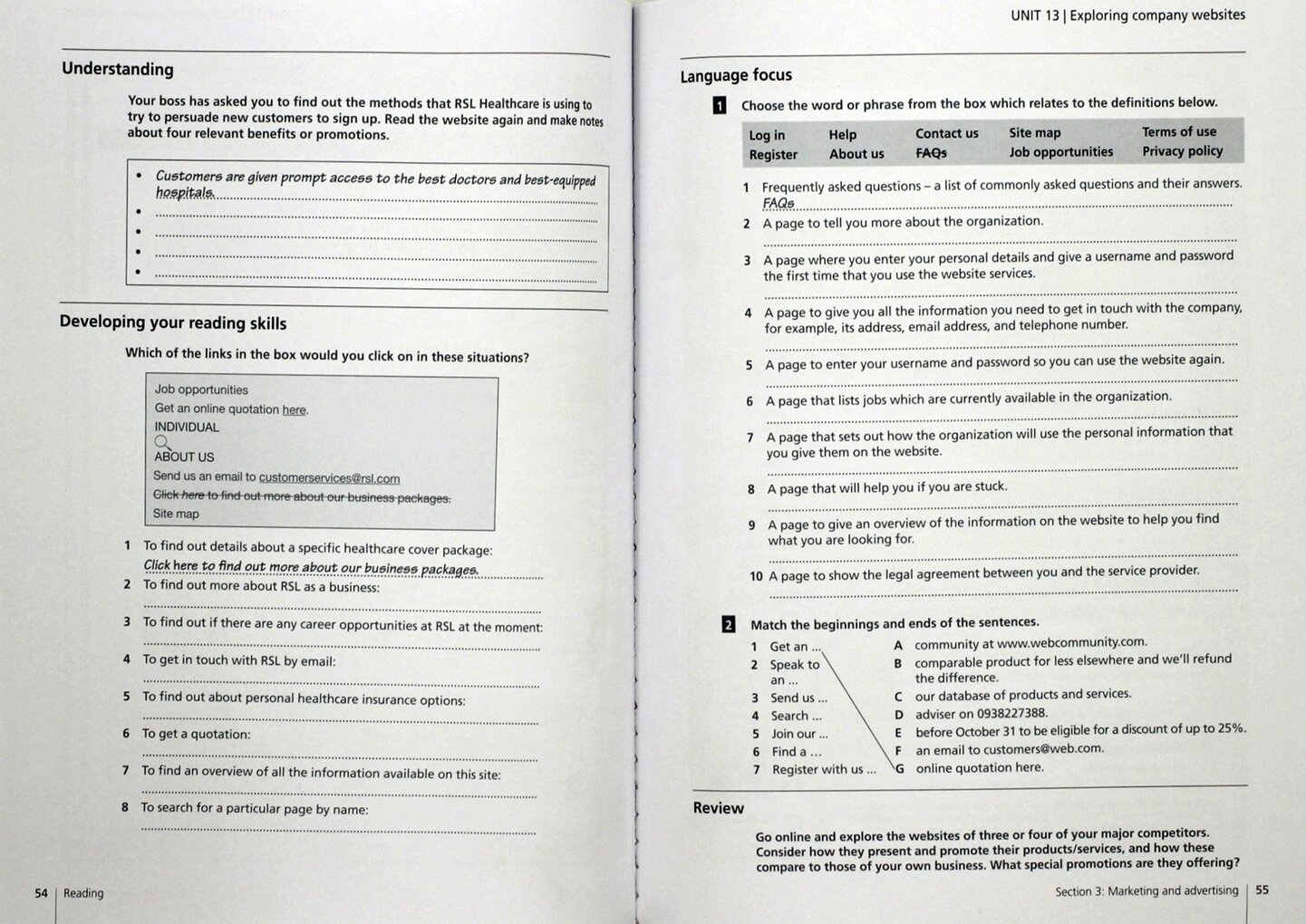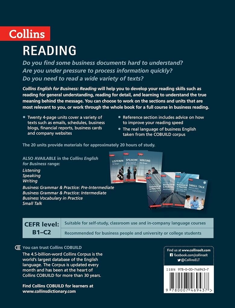 To understand all the documents you come across at work you need to practise reading different kinds of text.This brand new self-study book is the ideal way for business people to refine their reading skills in English. It provides practice reading the kinds of texts that business people come into contact with at work every day, using authentic examples from real business situations. It is aimed particularly at executives who communicate in English frequently or work in foreign or multinational companies.The twenty 4-page units focus on a wide variety of texts, which are useful as a quick-reference guide or for more in depth study and practice:• Section 1: Emails• Section 2: Business documents such as agendas, CVs, job descriptions and annual reports• Section 3: Marketing and advertising, including company websites, brochures and social media such as Twitter• Section 4: Business media, for example reading newspaper reports, financial news and business blogs.• Each unit contains practice activities and exercises; key vocabulary and phrases and grammar tips, with notes on American English variants• Includes helpful advice on different reading styles, such as reading for gist and reading for detail• Reference section with advice on how to improve your reading speed, and tips to help you choose the best reading method to find the information you need• Also focuses on useful skills not covered in traditional reading courses, such as ‘reading between the lines’ or understanding the true meaning behind the message• Includes an answer key, making it ideal for self-study• Powered by COBUILD – using the real language of business English