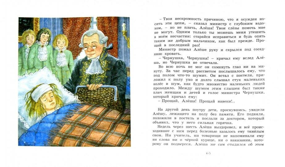 Книга хорошо издана. Белые страницы, четкий крупный шрифт. В начале книги статья на 2 листа журналиста и писателя Д.Рогожина "Первые литературные сказки". Иллюстрации изящные, своеобразные, в приглушенных тонах. Не могу сказать, что душа моя поёт с ними в унисон. Но мне хочется, чтобы в доме у нас были книги с иллюстрациями разных художников. а сын уж потом пусть сам выбирает, что ему по сердцу.