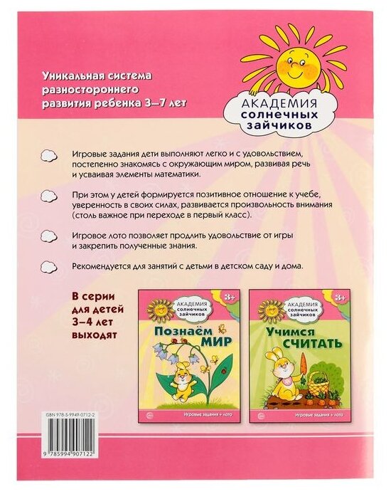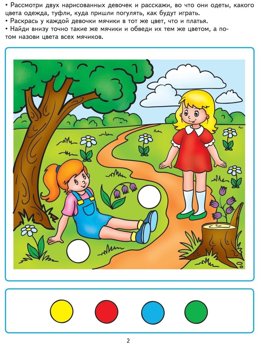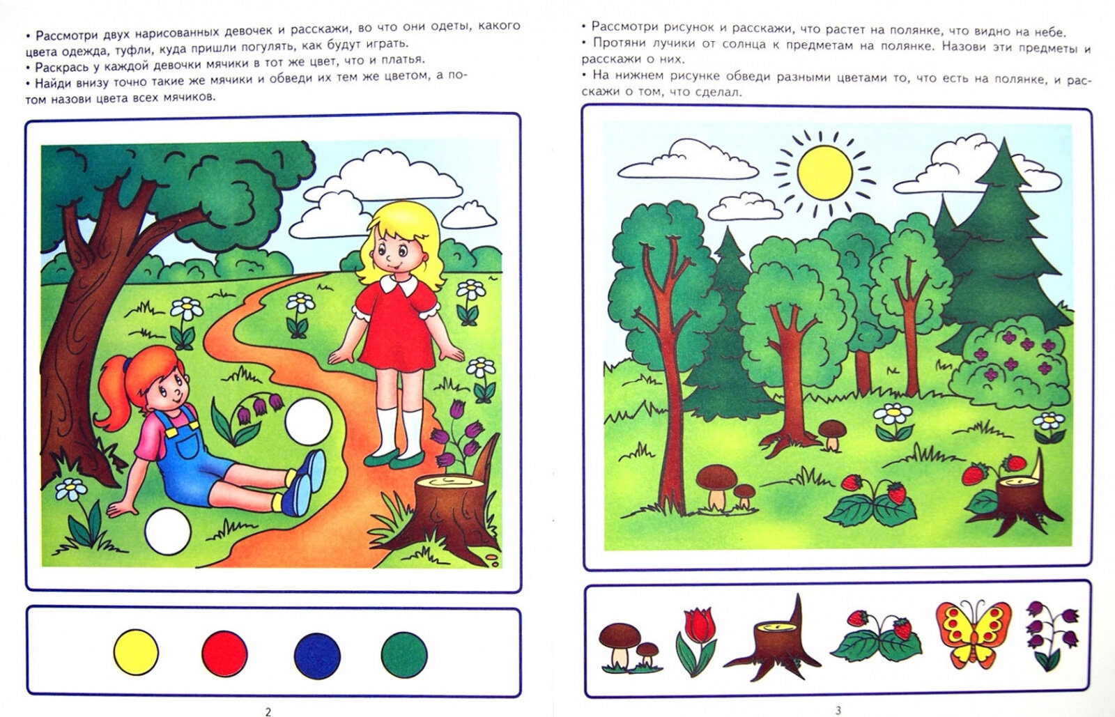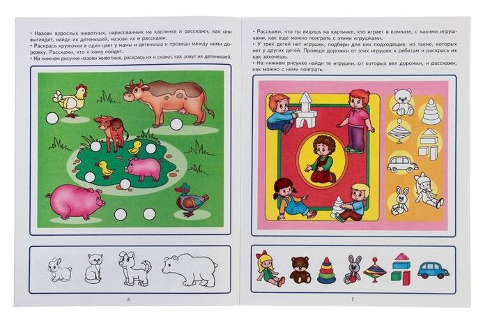 Книга для занятий с детьми 3—4 лет, которая поможет развить речь, мышление и внимание. При работе с ней ребенок пополнит словарный запас, будет учиться выстраивать свои высказывания, а также составлять элементарные описательные рассказы по картинкам и окружающим объектам. Внимательно следите за речью малыша, поправляя неправильно произносимые им слова. Задавайте наводящие вопросы: «Какая кукла?», «Во что одета?», «Что делает?» и т.д. Просите ребенка вспоминать и рассказывать, какие задания выполняли раньше. Предполагается, что выполнение заданий на одной странице — это одно занятие (но не более 15 минут). В середине книги вы найдете вкладыш, который нужно аккуратно вынуть и разрезать по пунктирным линиям. Варианты игр вы можете прочитать ниже или же придумать сами. Важно не предлагать ребенку сразу большое количество картинок, а увеличивать их по мере усвоения материала.