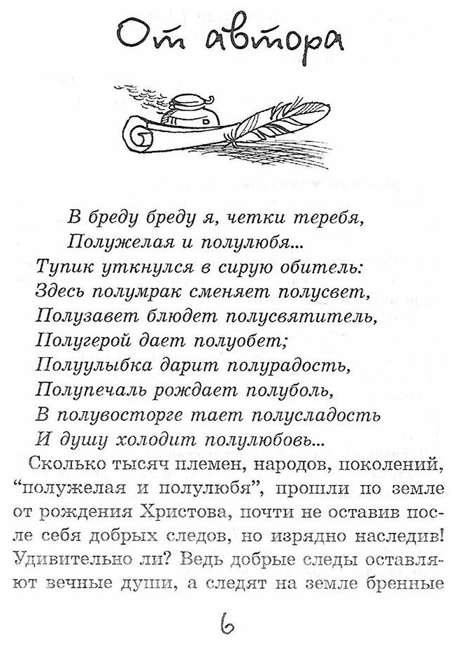 Эта книга – сборник рассказов (их больше 30), объединенных темой любви к близким, к ближним, к Богу. Рассказы очень добрые, иногда с юмором, некоторые овеяны свелой грустью. Много небольших черно-белых контурных иллюстраций по теме рассказов, в текстах рассказов всречаются авторские стихи. На форзацах представлена красочная кара Иерусалима при жизни Христа. Поля не особо широкие, шрифт крупный, книжка маленькая.