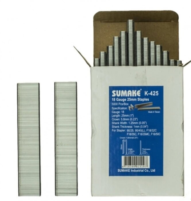 Скобы Sumake предназначены для пневмостеплеров 90/25, 90/40, которые служат для сборки каркасов изделий и монтажа различных панельных элементов. Данные степлеры легко работают со скобами большой длины. Сечение проволоки данных скоб 1х1,25 мм.