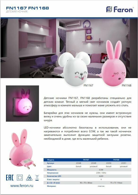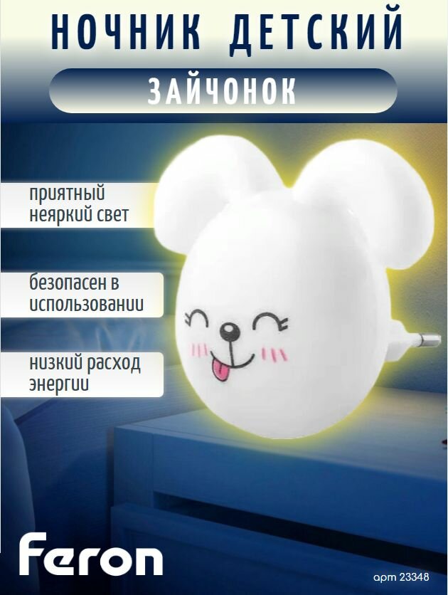 Ночник светодиодный для детской IP40 - продукт известной компании Feron (Китай). Имеет максимальную мощность 0.5 Вт, освещает площадь до 1 кв. м. Отлично подойдет для таких мест, как детская. Впишется в интерьеры следующих стилей: яркое и цветное.