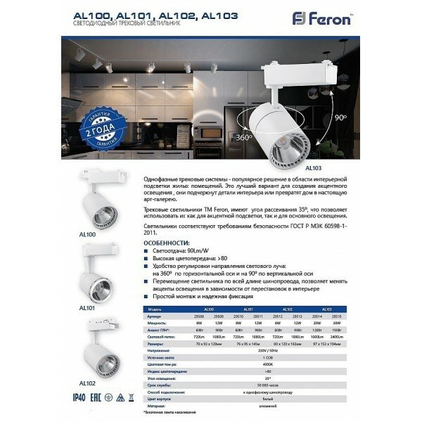 Трековый светильник AL100 - продукт известной компании Feron (Китай). Имеет максимальную мощность 8 Вт, освещает площадь до 2 кв. м. Отлично подойдет для таких мест, как гостиная, кафе, кухня, офис, магазин. Впишется в интерьеры следующих стилей: современный.