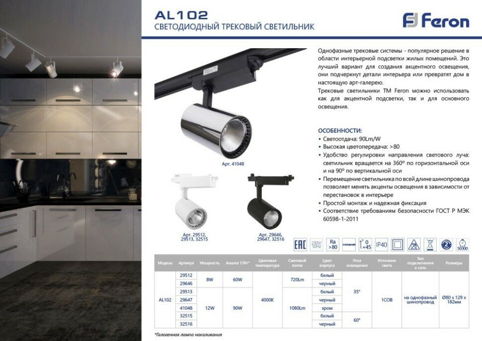 Трековый светильник AL102 - продукт известной компании Feron (Китай). Имеет максимальную мощность 12 Вт, освещает площадь до 2 кв. м. Отлично подойдет для таких мест, как гостиная, кафе, кухня, офис, магазин. Впишется в интерьеры следующих стилей: современный.