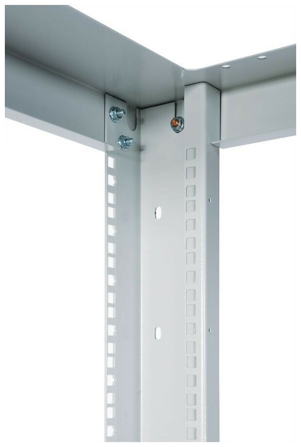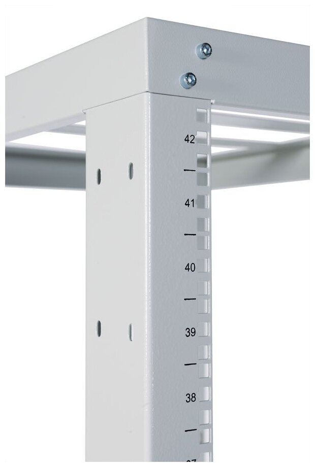 Стойка имеет полностью разборную двухрамную конструкцию, каркас повышенной жесткости скреплен болтами с внутренними шестигранниками. На вертикальные направляющие нанесена юнитовая маркировка.
