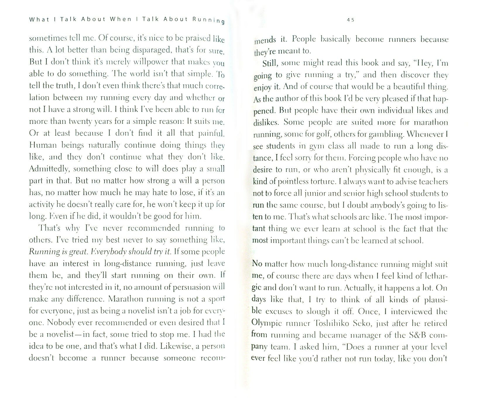 Сборник личных эссе о писательстве, выносливости и беге рассматривает влияние бега на жизнь и творчество автора. В девяти коротких эссе Харуки Мураками путешествует из Токио в Бостон, подробно описывая свой режим тренировок для Нью-Йоркского марафона 2005 года и размышляя о том, что значит для него бег. Автор утверждает, что бег, как и писательство, является способом ежедневной самодисциплины, но не настолько, чтобы эта идея могла служить тезисом для книги, которая получилась немного разрозненной и слабой. Эссе ощущаются оторванными друг от друга, и каждое из них выглядит как набор слабо связанных между собой мыслей; Мураками пытается, но безуспешно, замаскировать недостаток содержания своей книги обилием прозаических описательных пассажей. В книге есть несколько интересных моментов, но на меня она не произвела такого впечатления, как на многих других.