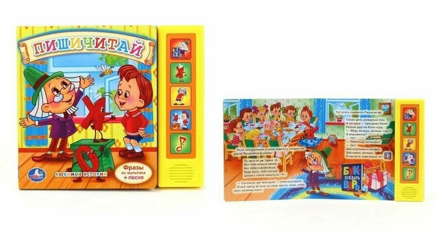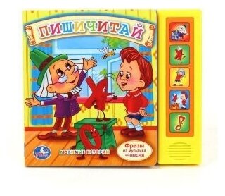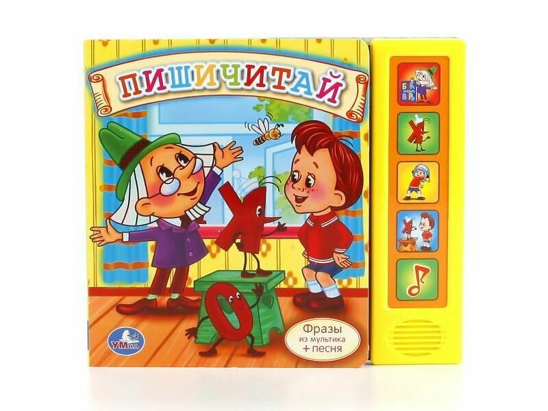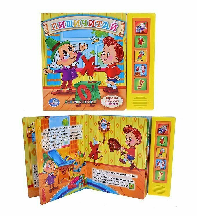 Перипетии сюжета "Пиши читай" почти также увлекательны, как и в одноименном мультфильме, но с озвученная книжка - это совершенно другое развлечение. На этот раз ребёнок не будет пассивно смотреть в экран, а станет слушать интересную историю, наслаждаясь фразами и песенками из мультика, развивать воображение, тренировать фантазию и творческие наклонности.Музыкальная книжка с кнопками "Пиши читай" предназначена для чтения взрослыми детям. Играя с интерактивной красочной книжкой, детишки развивают зрение и слух, лучше запоминают прочитанное, то есть в конечном итоге развиваются интеллектуально и эмоционально.