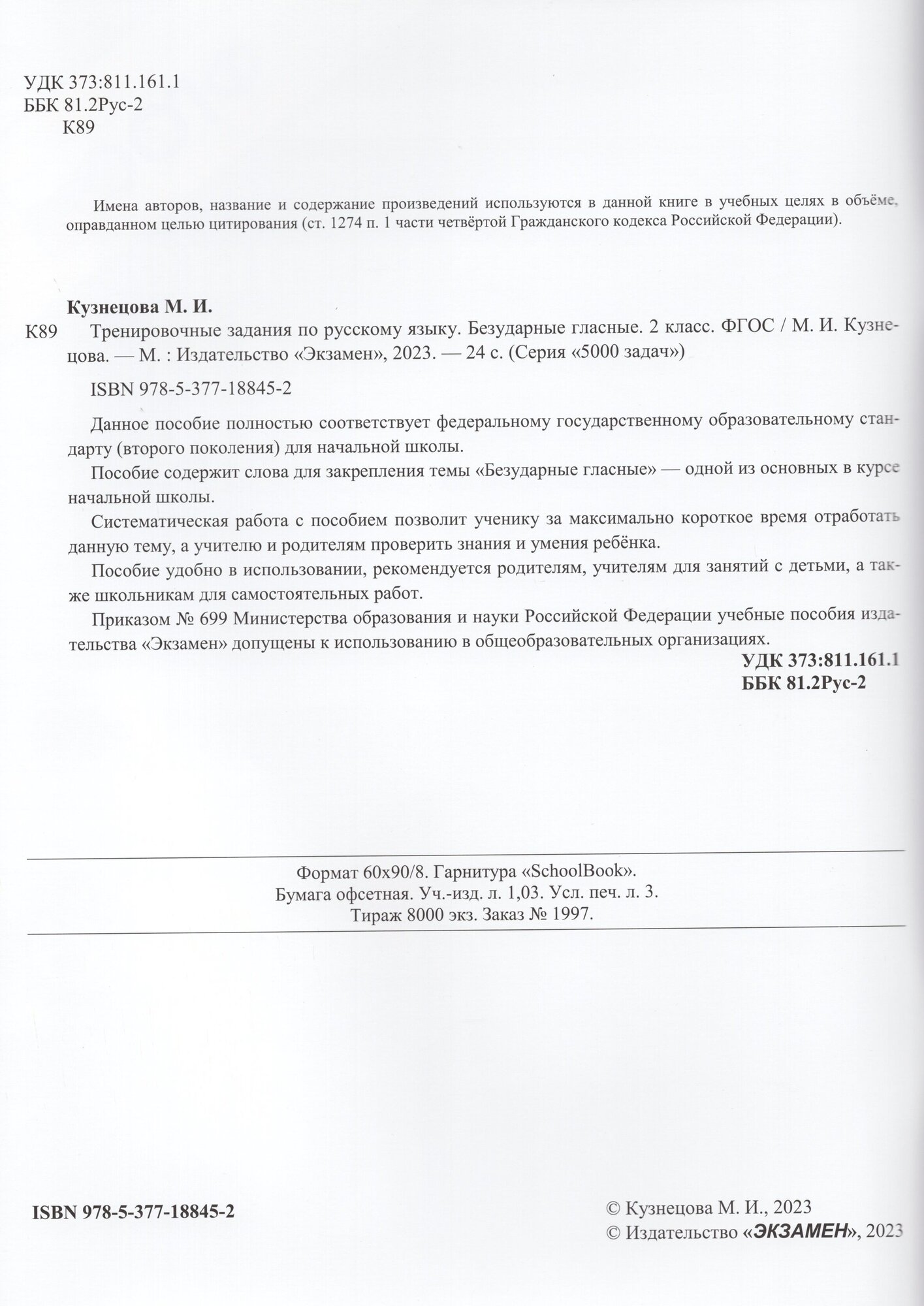 Тренировочные задания по русскому языку. Безударные гласные. 2 класс (Кузнецова Марина Ивановна); Экзамен, 2022