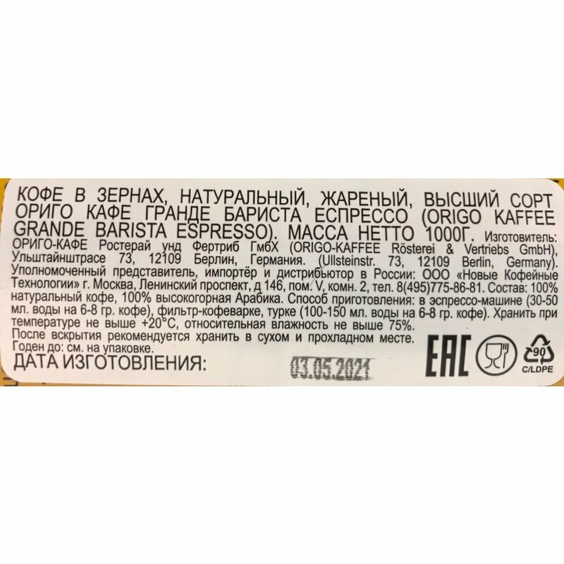 Кофе в зернах ORIGO Kaffee Grand Barista Espresso 1000гр.