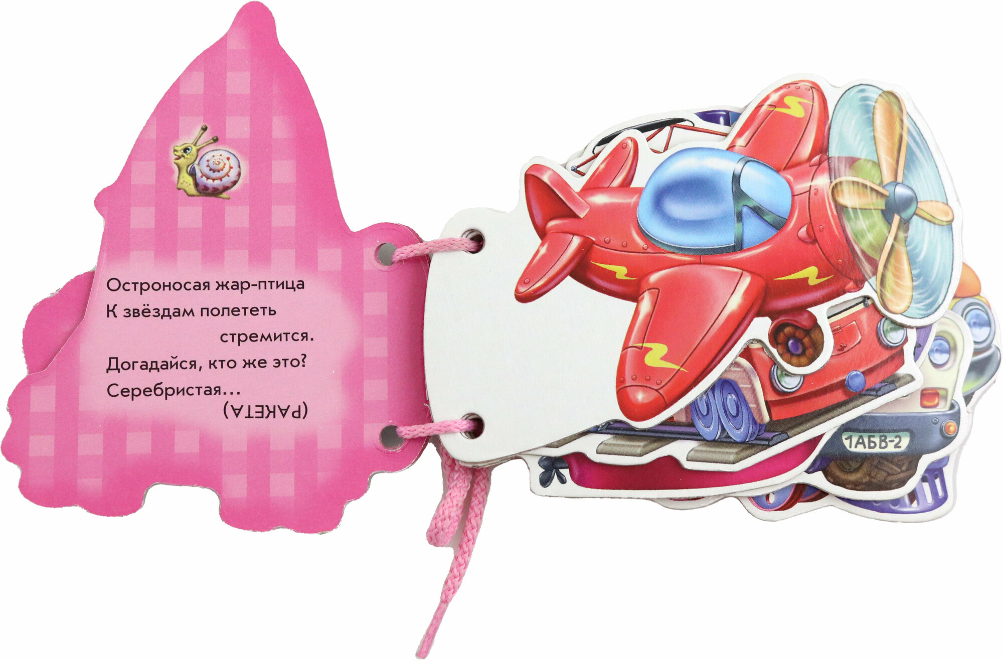 Книга из плотного картона. Покупая, думала, что будут только машины, что по дороге ездят. Оказалось интереснее: машина, трамвай, самолет, ракета,грузовик, пароход и паровоз! Каждая страница в форме машины, на обратной стороне загадка про нее. Рисунки очень приятные, разноцветные, с мелкими деталями.
