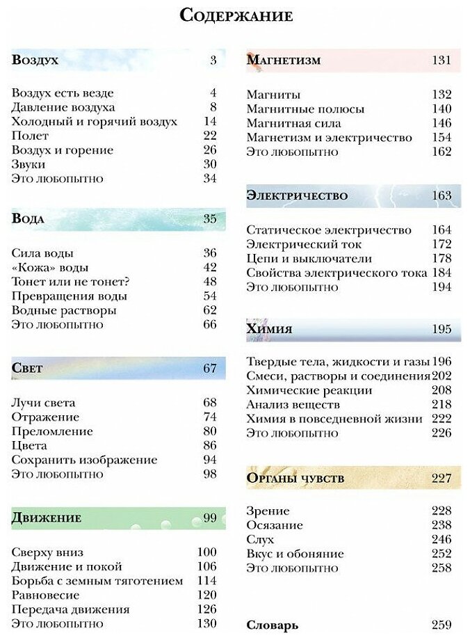 Замечательная книга! В ней описано более 200 опытов из следующих разделов: - Воздух, - Вода, - Свет, - Движение, - Магнетизм, - Электричество, - Химия, - Органы чувств. В конце каждого раздела - рубрика "Это любопытно". Перед каждым опытом задаётся вопрос (например, "почему идёт дождь?", "все ли предметы отбрасывают тень?", "как работает фотоаппарат?"), затем следует название опыта, описание того, что потребуется, ход самого опыта, его результат и очень полезная рубрика "Это потому...". Основные выводы вынесены отдельно внизу страницы. Книга красивая, в ней много цветных рисунков. Отдельно хочу сказать о требуемых материалах: в отличие от других подобных книг здесь используются очень простые вещи, которые есть практически в каждом доме. В книге есть Словарь терминов, что делает её ещё более ценной.