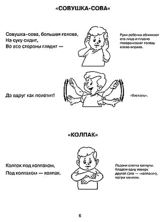 Только правильнее было бы назвать не "пальчиковые" игры, а "ручные" :) Потому что очень многие движения надо делать руками, а не пальцами. К минусам сборника можно отнести черно-белые иллюстрации. Если бы они были поярче и побольше, ребенку было бы интереснее делать упражнения. -