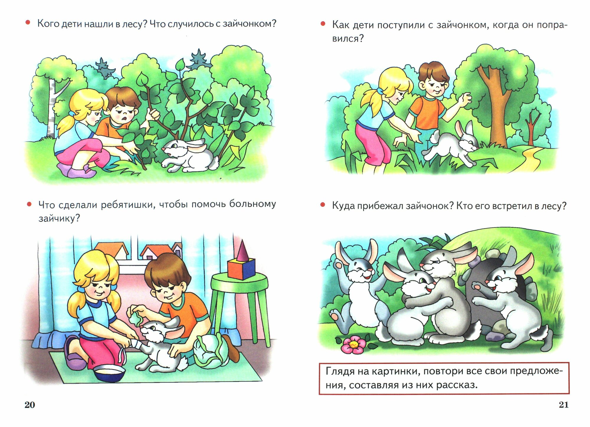 Книга очень нужная. Всегда стоит проблема, как научить ребёнка составлять рассказ по картинке или по серии картинок. А в этом пособии картинки сопровождаются рядом вопросов, отвечая на которые ребёнок выстраивает предложения и затем составляет из полученных предложений текст. Ребёнку 4 лет легко по ним заниматься.