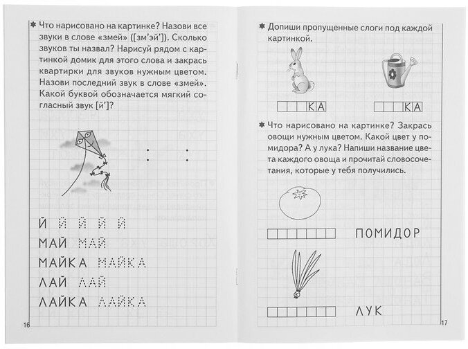 Предлагаем вашему вниманию задания по развитию навыков чтения и грамотного письма без пропусков и замены букв, которые помогут вашему ребенку успешно подготовиться к школе. Прежде чем начать заниматься, ознакомьтесь со следующими рекомендациями: - Звуки мы произносим и слышим. На письме звуки обозначаются буквами. - Буквы А, О, У, И, Ы, Э, Е, Ё, Ю, Я обозначают гласные звуки. А->[А], О->[О], У->[У], И->[И], Ы->[Ы], Э->[Э]. - После мягких согласных и твердых ([Ж], [Ш], [Ц]) буквы Е, Ё, Ю, Я обозначают один гласный звук: Е->[Э], Ё->[О], Ю->[У], Я->[А]. - В начале слова, после гласного, после Ь и Ъ знаков буквы Е, Ё, Ю, Я обозначают 2 звука: Е->[Й'Э], Ё->[Й'О], Ю->[Й'У], Я->[Й'А]. Следовательно, гласных звуков всего лишь 6: [А], [О], [У], [Ы], [И], [Э]. Е, Ё, Ю, Я - это буквы, а не звуки. - Буквы Ж, Ш, Ц обозначают только один твердый звук: [Ж], [Ш], [Ц]. - Буквы Ч, Щ, Й обозначают только один мягкий звук: [Ч'], [Щ'], [Й']. - Буквы Ь и Ъ звуков не обозначают, это знаки, которые показывают твердость или мягкость предшествующего согласного и отделяют некоторые гласные от согласных, чтобы они не сливались (Ь еще может выполнять функцию показателя мягкости согласных). - Для развития фонематического слуха (умение слышать звуки и переводить их в буквы) дети строят звуковые домики для слов, закрашивая квартирки гласных звуков красным карандашом, твердых согласных - синим, мягких согласных - зеленым. - Чтобы узнать количество звуков в слове, надо произносить по порядку все звуки и загибать пальчики на каждый звук (например, МЯЧ->[М'], [А], [Ч']). - В русском языке много слов, произношение которых расходится с написанием. В этих случаях все равно идем от слухового восприятия слова и объясняем, что писать это слово надо по-другому (например, [СТАЛЫ]->СТОЛЫ, [НОШ]->НОЖ). Желаем успеха Вашему ребенку!