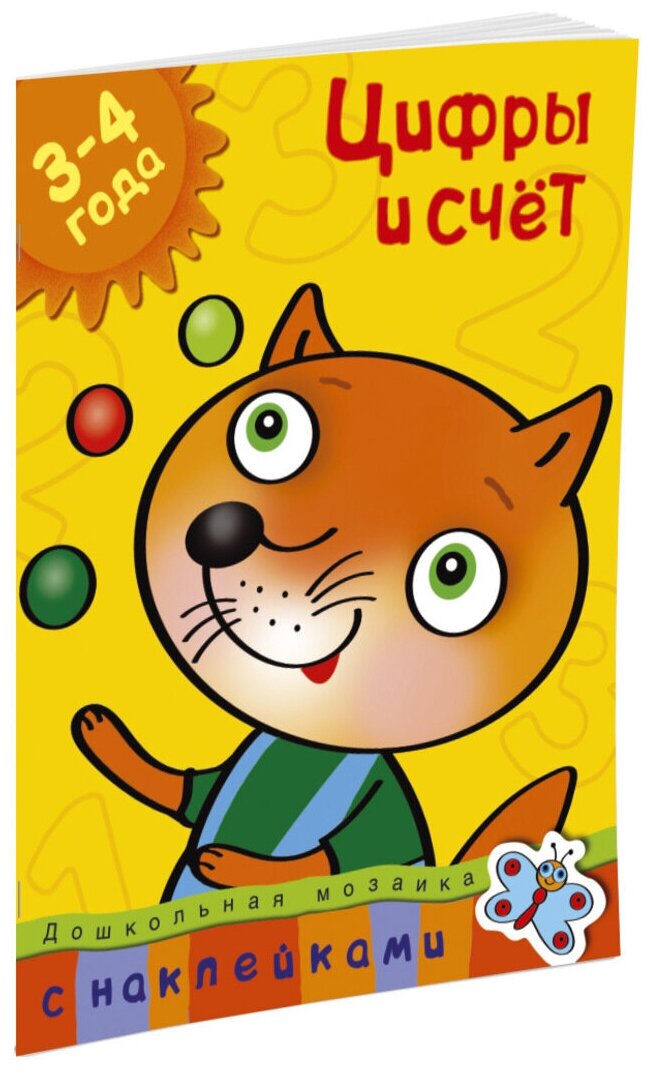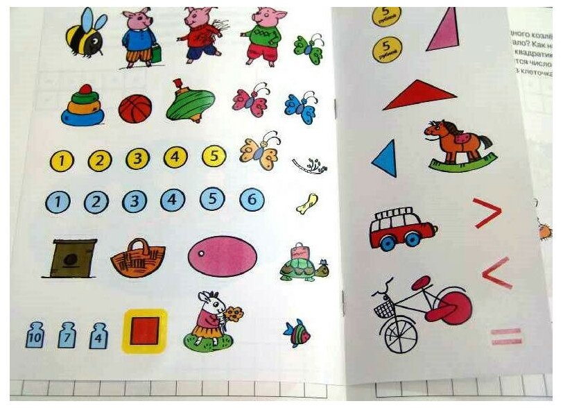 Интересно и достаточно разнообразно, здесь и написание цифр от 0 до 10, простой счет, состав чисел по рисункам, сравнение и равенство, сложение и вычитание чисел, без помощи рисунков, раскрашивание картинки, по цифрам и примерам, повторение фигур. В завершении две небольшие задачки. Книжка на белой, достаточно плотной бумаге, симпатичные рисунки, небольшие наклейки.
