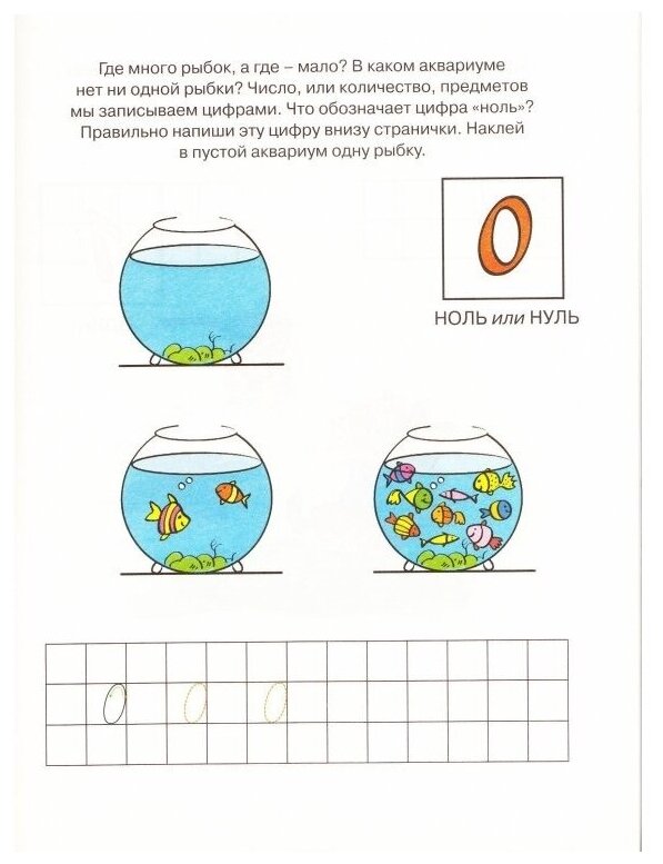 Очень понравилась эта тетрадка. Здесь есть прописи на все числа от 0 до 10 (собственно пропись, картинка, задание - закрасить х клеточек) и простенькие задания: состав числа, больше-меньше, раскраска по цифрам, соедини числа по порядку, числовой ряд, простенькие задачки на сложение-вычитание. Нужно как наклеивать наклейки, так и самостоятельно писать, рисовать, раскрашивать.