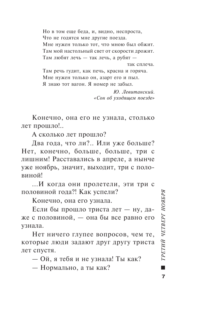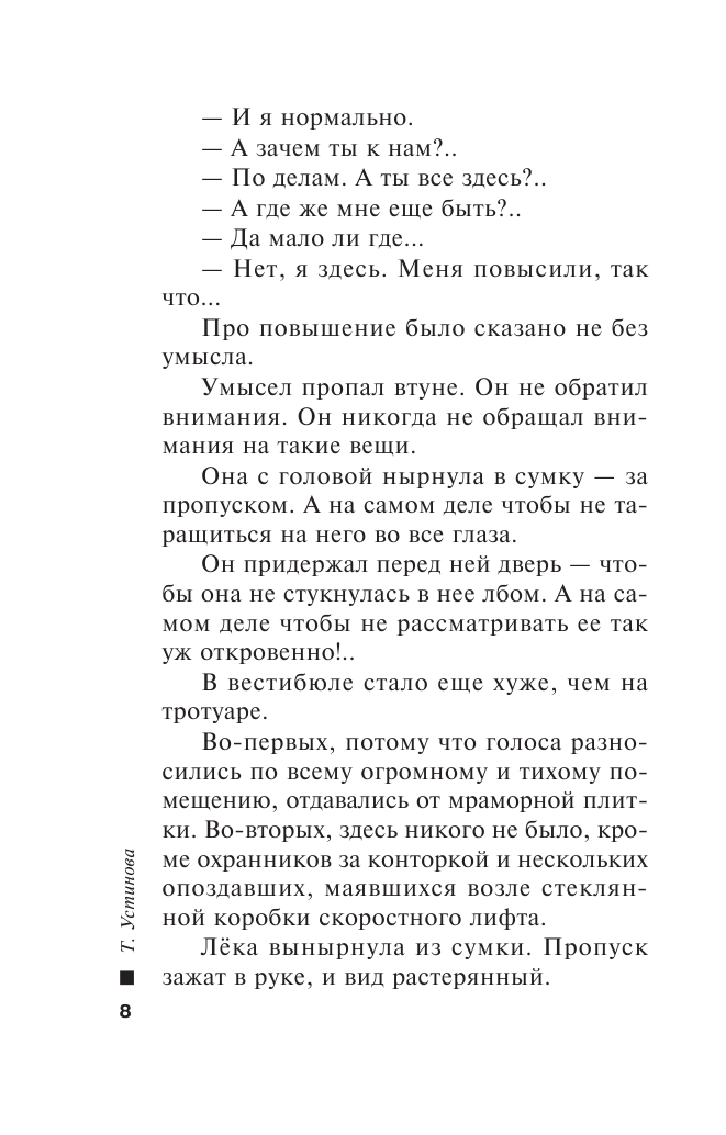 Взяла с собой эту книгу в поездку: облегчённый вариант (по весу) и любимая писательница. Летела в одну сторону в обнимку в ЧЕТВЕРГОМ, а обратно с ТВЕРСКОЙ 8 (это вторая повесть, вошедшая в сборник). Скоротала обе дороги, поскольку Устинова захватывает целиком, что когда к тебе обращается стюардесса с тем или иным вопросом, не сразу соображаешь где ты. Многие разочаровались в последних книгах Устиновой (кризис во всём), но тем не менее она пишет тёплые, душевные вещи. Меня спросили, о чём читаешь? Конечно, о любви. В первой повести она есть, у людей не молодых, но зрелых, и от этого история не стала менее нежной. Детективный налёт пропал полностью, хотя в повествовании есть неожиданное исчезновение одной из героинь с важными документами, и то в конце становиться ясно, что это не криминал. Вторая повесть о любви. Но только к книгам (что будет понятно всем, кто здесь собирается). Небольшой экскурс в жизнь директора того самого книжного магазина Москва на Тверской. Переплетаются два смутных времени: сегодняшний кризис и перестройка 90-ых. Похоже-похоже, как похоже. " Одно государство пропало, погибло, а другое ещё только нарождается, вылупляется из яйца, и непонятно, кто вылупиться, белый лебедь свободы или чешуйчатая рептилия капитализма, наживы и стяжательства. Повсеместно месяцами не платили зарплату, скудные денежки ещё и обесценивались с каждым днём....". Возможно, то время будет интересно людям, молодость которых совпала с теми годами. А я ещё и успела поностальгировать о самой улице Тверской. Я как раз работала тогда там, только на противоположной стороне, на не чётной, там где центральный телеграф, театр Ермоловой, новый отель Ритц на месте бывшего Интуриста. И я так живо представила танки, идущие по улице, что второго раза совсем не хочется. А вот Устинову читать хочется всегда.