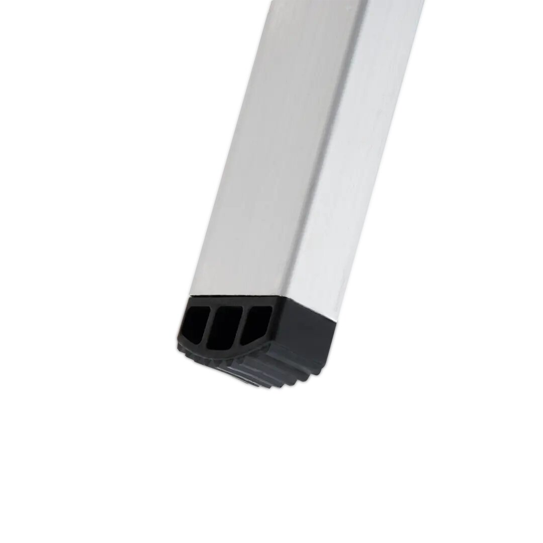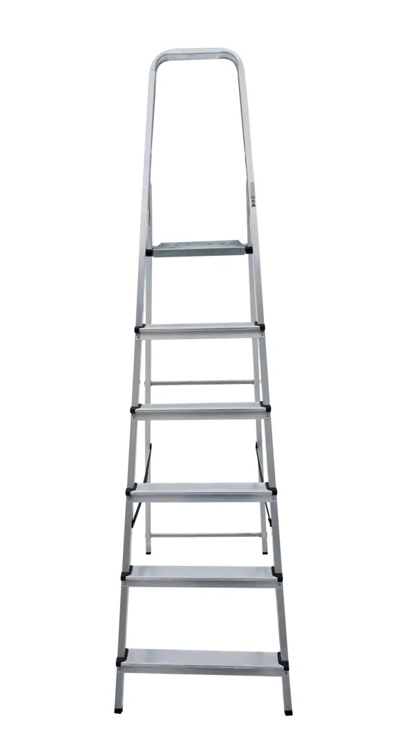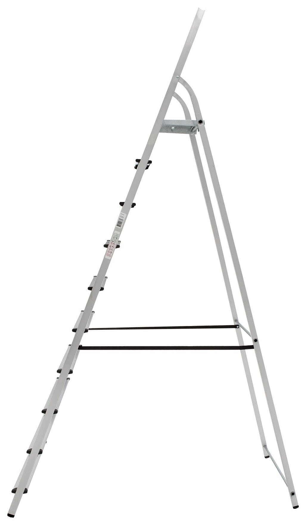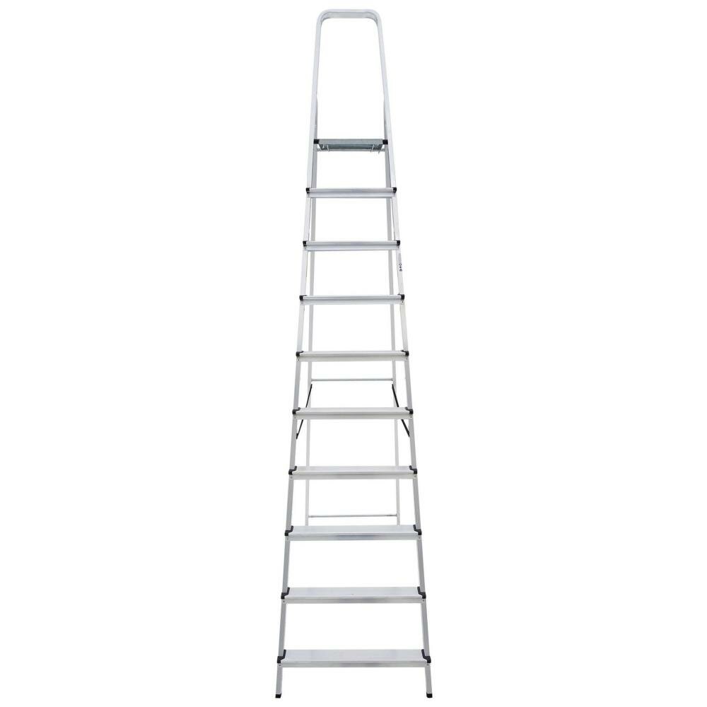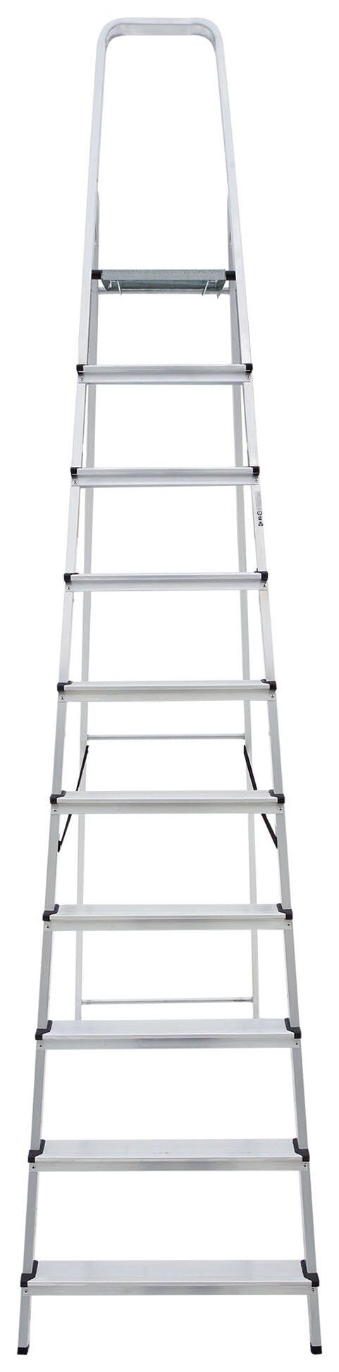 Данная модель стремянки с девятью ступенями отлично подходит для дома с высотой потолков 3,6-4,0 м. Очень легкая и достаточно устойчивая несмотря на кажущуюся недостаточную толщину алюминиевого профиля боковых стоек и ступеней. Также надо иметь в виду, что эта стремянка весьма габаритная, и даже в сложенном состоянии (около 3 м) требует соответствующего места для хранения. Качество изготовления среднее, и соответствует цене.