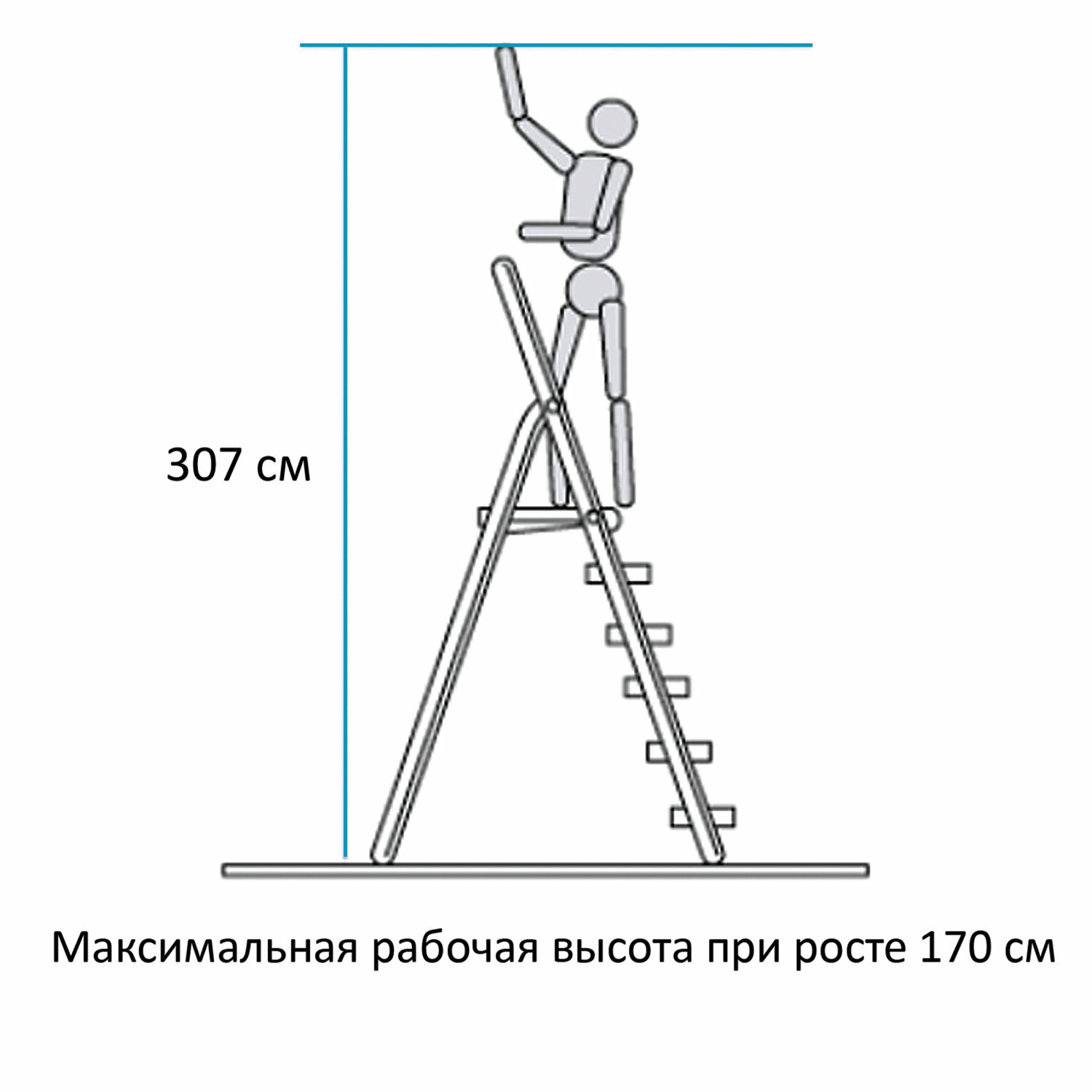 | Прочие особенности и свойства | Имеет повышенную прочность и надёжность при небольшом весе изделия, Легко устанавливается и обеспечивает высокий уровень комфорта, Ступени и стойки из прессованных алюминиевых профилей увеличенного сечения, Широкие увеличенные ступени глубиной 130мм, Рифлёная поверхность ступеней способствует безопасному подъёму и спуску, Прочное крепление ступеней к боковинам 6 заклёпками придаёт конструкции высокую устойчивость, Рифлёная безопасная площадка площадка из оцинкованной стали с порошковой покраской, Дуга безопасности 600 мм, Прочные страховочные ремни, Опорные наконечники из прочного пластика обеспечивают устойчивое положение, Компактность при хранении и транспортировке, Практичность и внимание к каждой детали гарантируют безопасность работы на любой высоте, Максимальная нагрузка 225 кг, Рабочая высота 303 см |