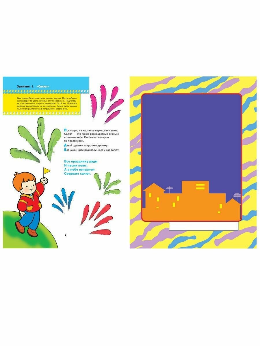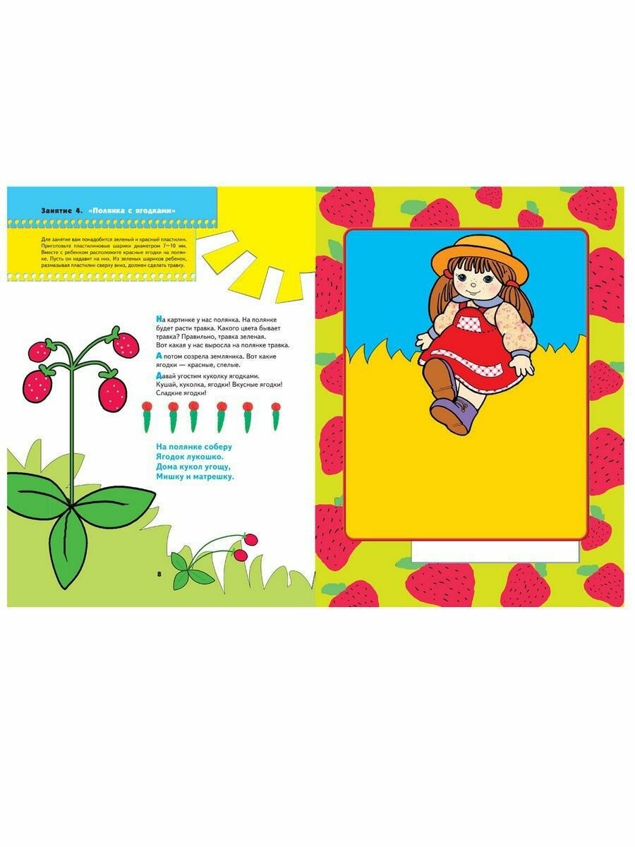 До появления этой книги в нашем доме, сына пластилин интересовал только на уровне "раскатать колбаску", теперь же мы с огромным удовольствием делаем эти картинки в книге и придумываем свои. книга яркая, привлекающая внимание ребенка. занятия короткие, несложные, но в тоже время интересные.