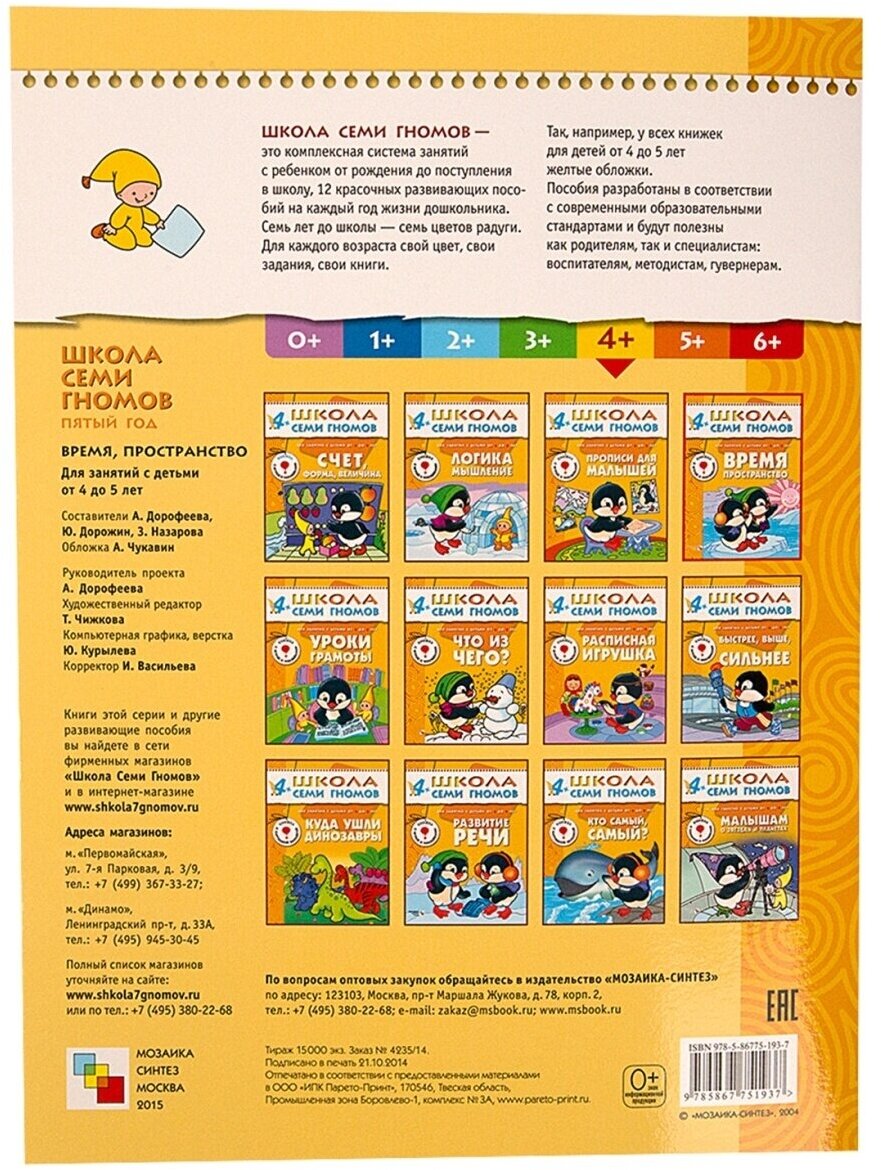 Книга "Время, пространство" развивающей серии "Школа семи гномов" научит малышей 4-5 лет ориентироваться во времени и пространстве.