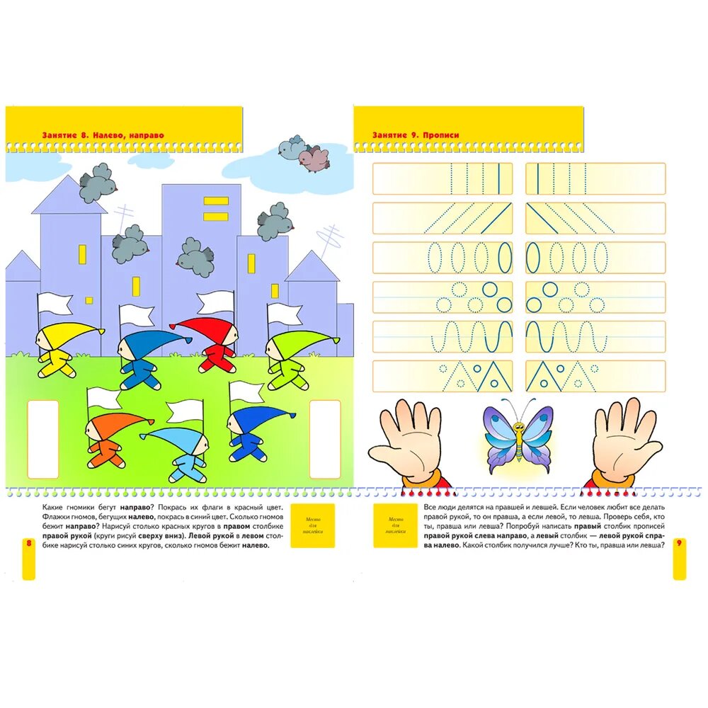 Книга развивает комплексное мышление, позволяет в игровой форме изучить пространство и время, подготовить руку к письму.
