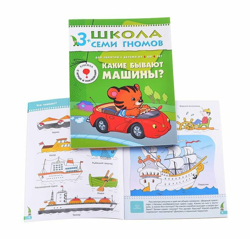 "Какие бывают машины" Школы семи гномов мой ребенок 3 лет просто обожает. С помощью этой книги он почерпнул новые знания о транспорте, и при этом не только названия и разновидности машин, но и что внутри машины. В этой книге в середине есть самолётик, который нужно вырезать и собрать. Естественно ребёнку желательно помочь, так как в рекомендованном возрасте 3-4 лет сделать это аккуратно пока сложно, но отмечу, это недолгое совместное занятие родителя с ребёнком - очень понравится обеим сторонам. Отмечу, что листы очень плотные, удобно, не порвать просто так. Советую всем родителям!