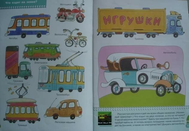 В книге вы встретите множество видов транспортных средств - здесь будут и привычные автобусы, автомобили, а также новые для малыша электровоз, автомобилевоз и много другой техники специального назначения.