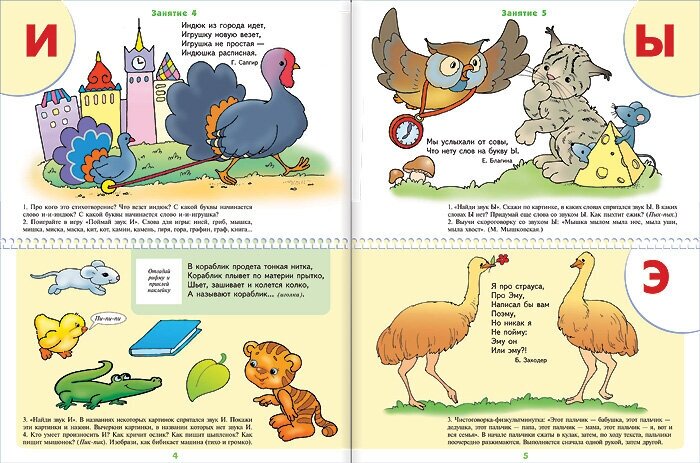 На каждую букву дается стихотворение, загадки и упражнения на узнавание буквы и звука.
