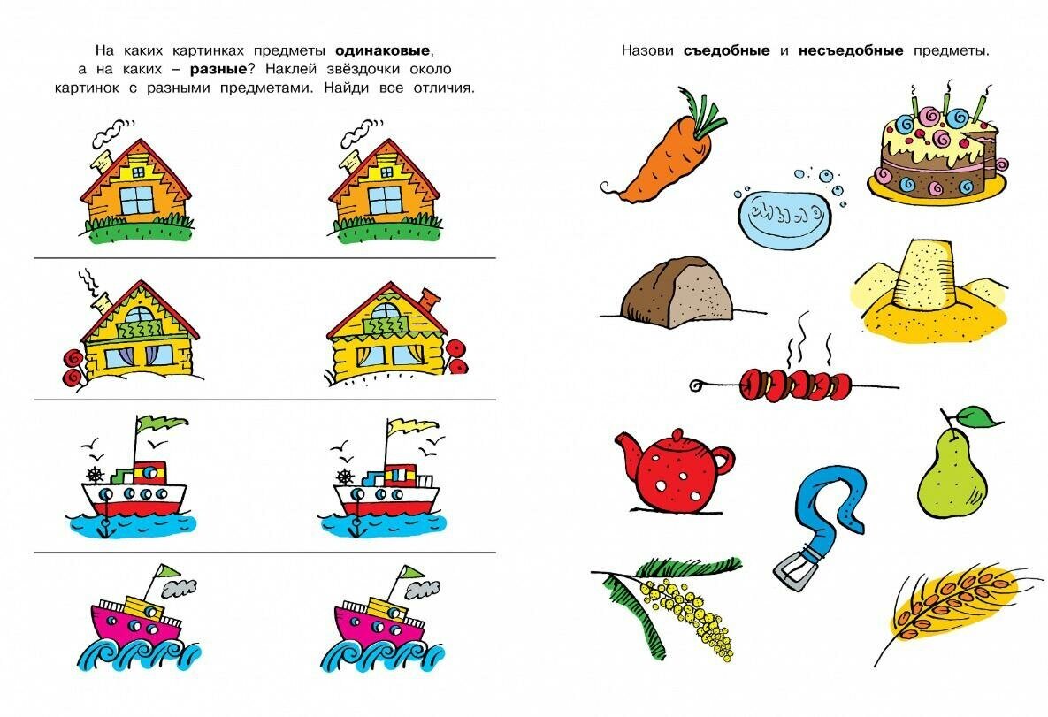 Продолжение одноименной книжки для 4-5 лет, причем мне показалось что она не сложнее, если прорешали предыдущую, то можно браться за эту. Задания на изучение свойств предметов(одинаковые, разные, съедобные, несъедобные, сладкие, соленые, кислые, горькие, горячие, холодные, пушистые, гладкие, колючие, острые, прочные, хрупкие, тяжелые, легкие, широкие, тонкие, новые, старые, полные, пустые, открыты, закрыты, горит, не горит, тонет, не тонет, быстро, медленно) Дорисовать детали, Найти пары предметов. Определение времени, дней недели. Симпатичные рисунки, небольшие наклейки, белая достаточно плотная бумага.