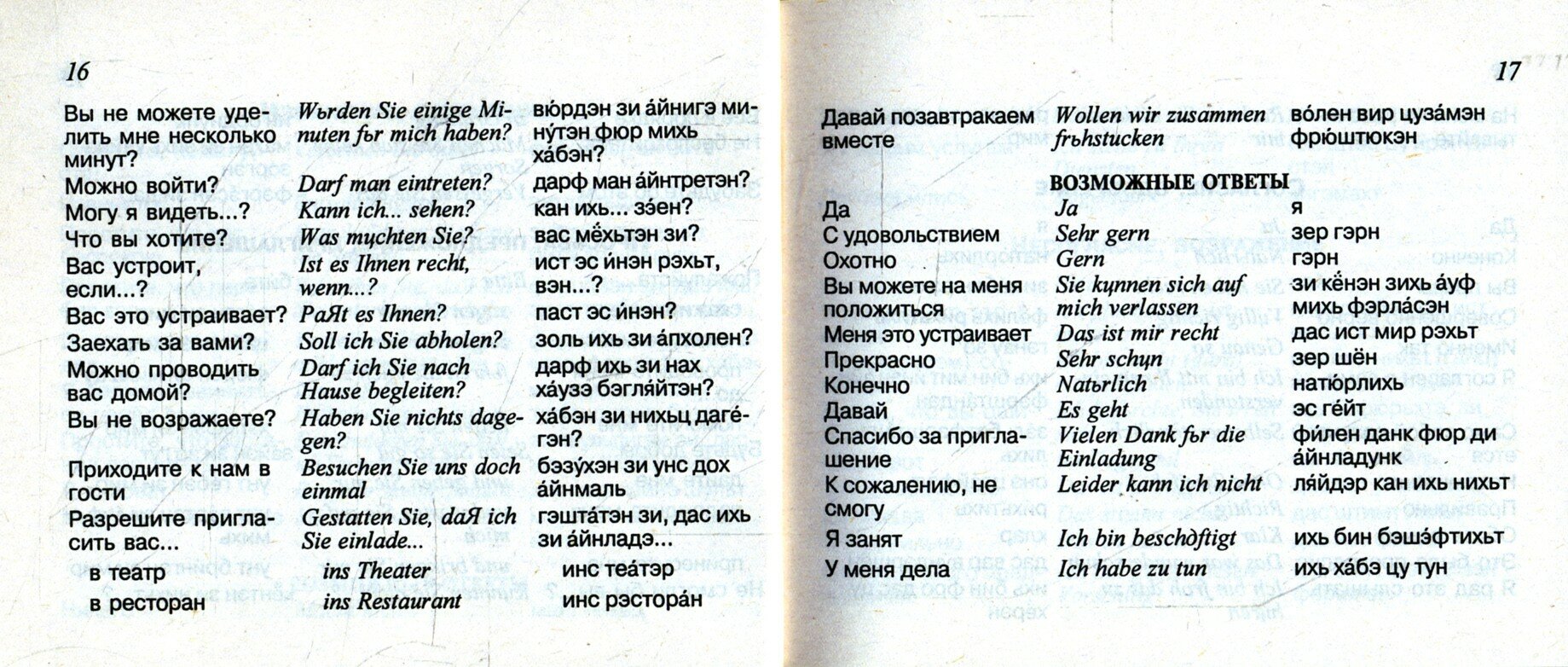 Искала дешевый разговорник, уж очень мне нравится, как звучит немецкий язык. Теперь благодаря немецким словам, написанным русскими буквами, я могу побыть немного немкой. Очень удобный карманный формат. А если много раз повторять фразы, они остаются в памяти. Проверяла на себе. Во ист ди банк?