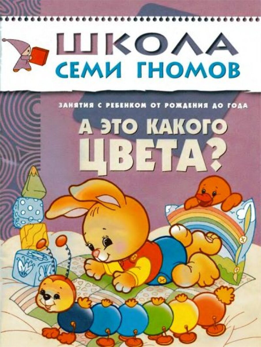 Книга "А это, какого цвета?" из серии "Школы семи гномов", рассчитана на деток от полугода, в этот период они с удовольствием рассматривают яркие и крупные изображения, а позднее отличают предметы разных цветов.