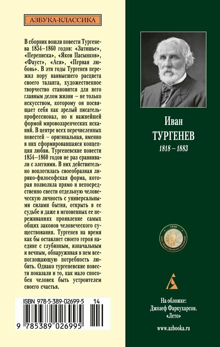В сборник вошли повести И. С. Тургенева 1854-1860 годов: "Затишье", "Переписка", "Яков Пасынков", "Фауст", "Ася", "Первая любовь". Содержание книги определено не только хронологической, но и внутренней связью этих произведений - темой любви. Тургенев на время как бы оставляет человека наедине с глубинным, изначальным и вечным, обнаруживая в нем всепоглощающую потребность любить. Однако тургеневские повести показали и то, как мало способен быть человек устроителем своего счастья.