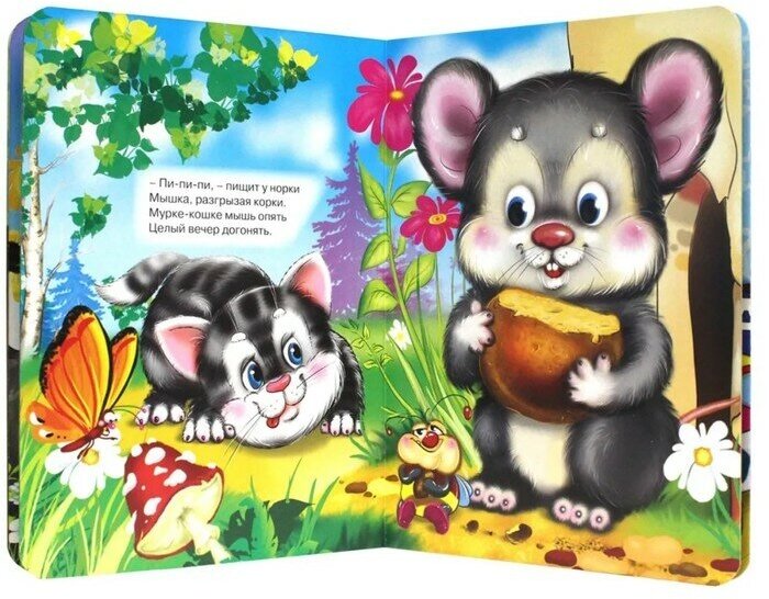 Книжки с глазками малыши очень любят. Это было главным при покупке. Картон плотный - не порвать, уголки для безопасности скруглены. С глазками получились следующие животные - кошки, собачка, мышка, воробей. Ребенку нравится перелистывать, изображать, как говорят нарисованные животные, тыкать пальчиком, показывая глазки. Все отлично, кроме стихов. Вроде стихи идут одним текстом с начала до конца, но при этом смысл теряется, информация скачет, строфа уходит. Хорошо, что малышу пока еще можно и без этих стихов играть с книжкой, по-своему прорабатывая картинки.