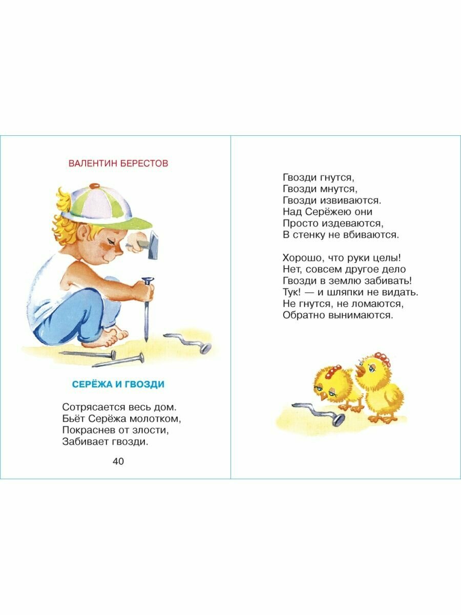 Хорошая книжка. Маленькая, но в ней помещается много стихов и иллюстраций. Странички плотные, белые. Обложка твердая. Картинки идеально подходят для детской литературы - рисунок крупный( насколько это позволяет формат) без излишних деталей.