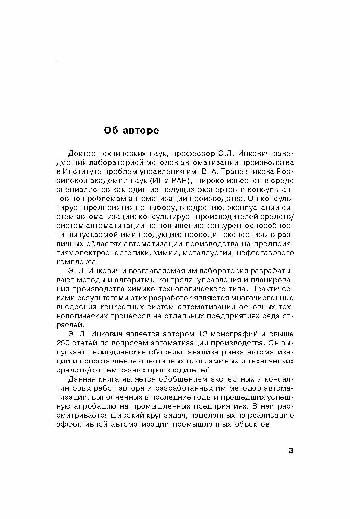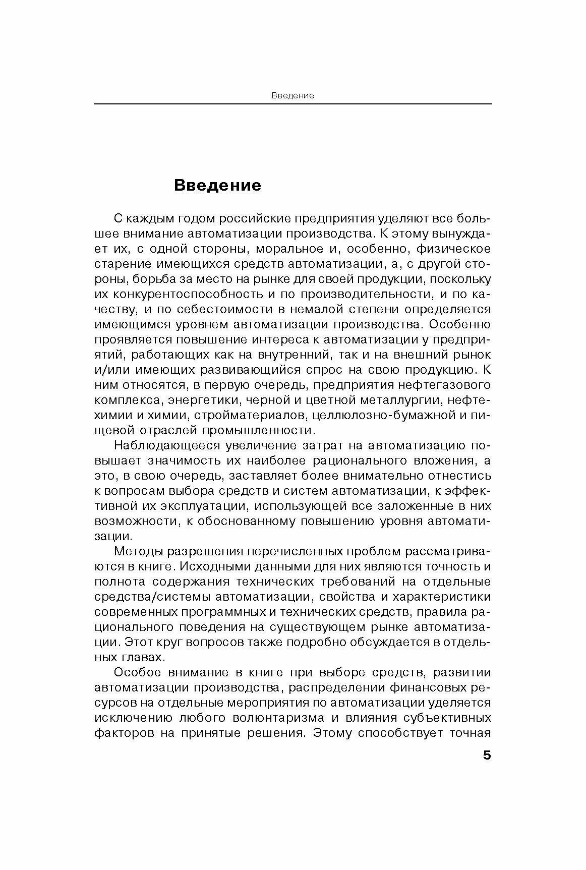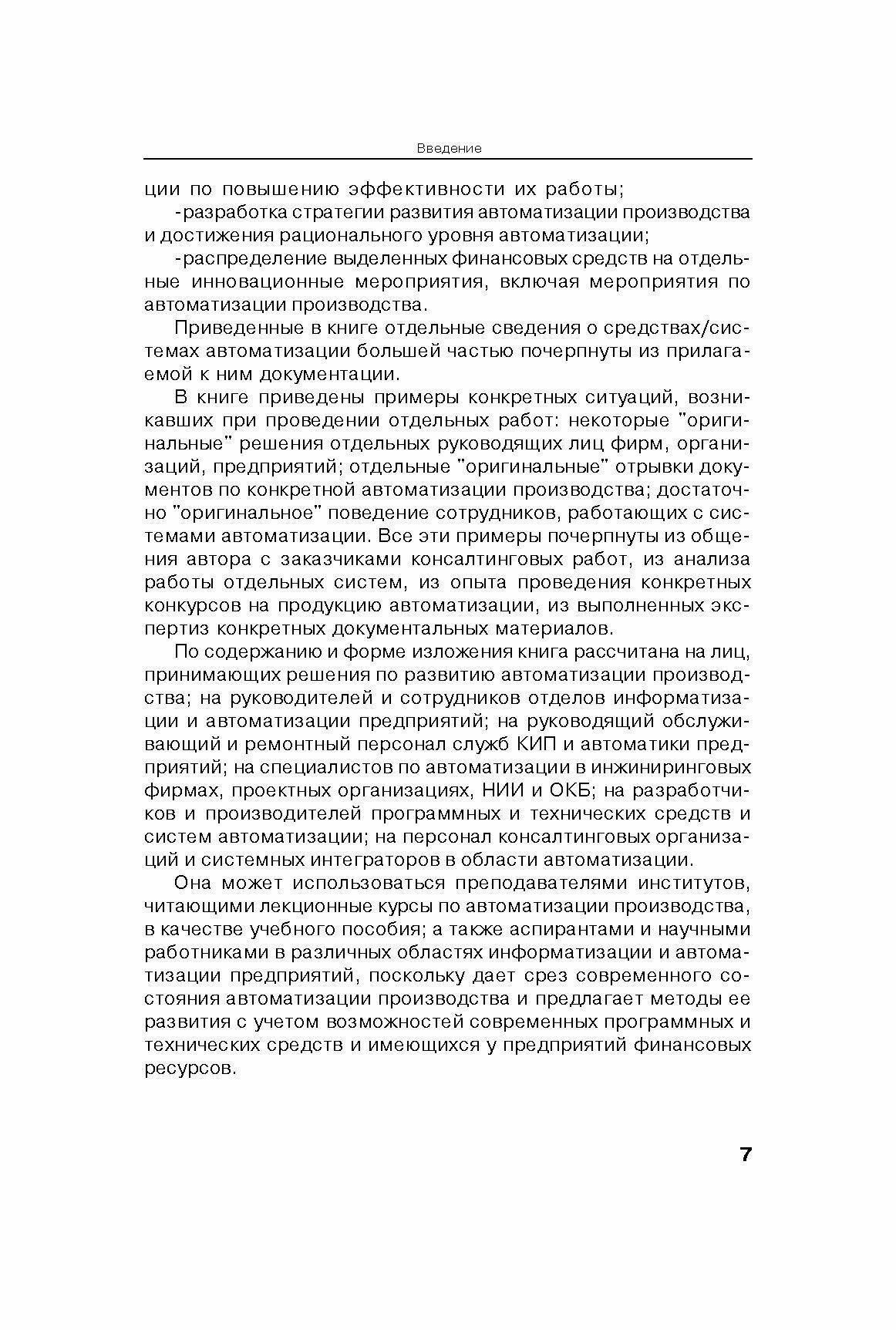 Книга рассчитана на сотрудников служб автоматизации предприятий; на специалистов по автоматизации в проектных институтах, НИИ и ОКБ; на разработчиков и производителей средств и систем автоматизации; на системных интеграторов в области автоматизации. Книга может использоваться преподавателями в качестве учебного пособия по курсам автоматизации, а также аспирантами и научными работниками в области автоматизации предприятий, поскольку дает срез современного состояния автоматизации производства и приводит методы ее развития с учетом возможностей современных программных и технических средств и имеющихся у предприятий финансовых ресурсов.