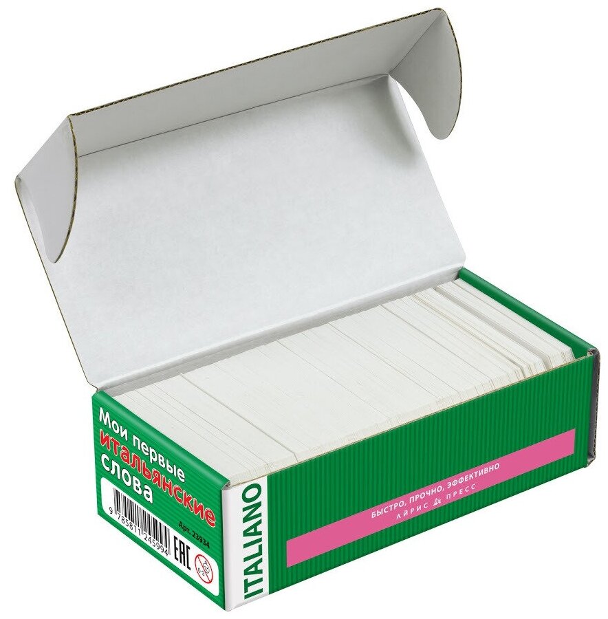 Весьма удобный набор в помощь начинающим учить итальянский. Карточки содержат название предмета или вещи, его изображение, транскрипцию и перевод. Картон достаточно прочный, чтобы не износиться до того, как вы запомните присвоенное карточке слово. Размер карточек маленький и доступен любому карману. Удобно для ленивых и не тратящих время для изготовления подобных карточек своими руками.