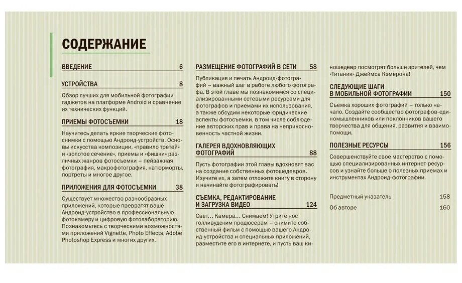 Книга содержит описание некоторых моделей смартфонов и приложений для обработки фотографий, а также интернет-ресурсов для размещения своих работ. Полезной информации, увы, практически нет (за исключением правила трёх третей и золотого сечения). Книгу выбрала в подарок, поэтому сожалений о потраченных впустую средствах нет)