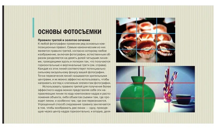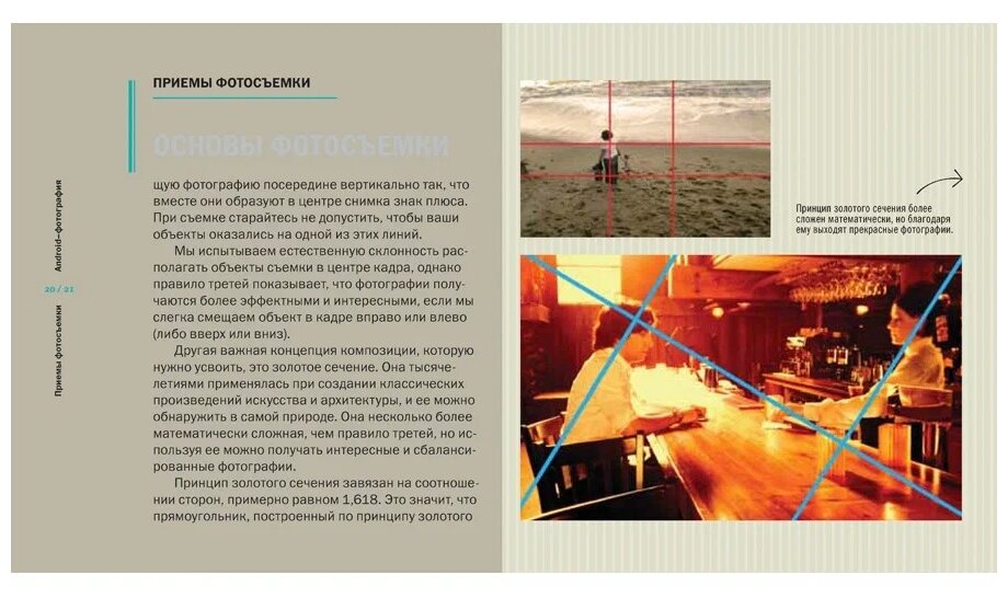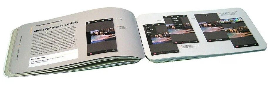 Книга выполнена оригинально в виде планшета.На этом её ценность заканчивается,увы.Полезной информации 3%.Рассказывается о правилах третей и золотого сечения на примерах,даются ссылки на несколько программ фотошопа из PlayMarket.Правила этики при публикации в соцсетях и инете.Не интересно и ничего полезного почерпнуть не смогла.Жаль.И цена за такую бесполезность довольно высокая.