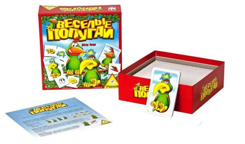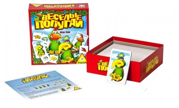 Прекрасный подарок для ребёнка и всей семьи. Этот замечательный игровой набор от фирмы Piatnik увлечёт не только детей, но и их родителей и станет приятным дополнением к семейному празднику. Игра тренирует память и логическое мышление. Игра построена по принципу всеми любимого MEMO, а делают процесс еще забавнее. У вас есть большие карточки с попугаями и маленькие с деталями того или иного попугая - клюв, хохолок, лапы разного цвета и формы. Все птицы очень похожи, но на самом деле они отличаются. Кто первый откроет 4 верных карточки, победил. Попробуйте ничего не перепутать! Игра рассчитана на 2-5 игроков.
