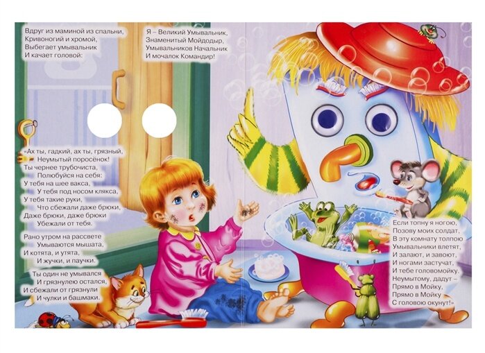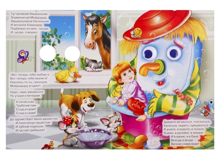 Это классика детской литературы. Не одно поколение детей выросло на истории про Мойдодыра и грязнулю-мальчика, и каждому будущему поколению необходимо знать эти стихи. Очень хорошая книжка, с яркими красочными иллюстрациями и двигающимися пластиковыми вставками в виде глазок. Для малышей прекрасный подарок.