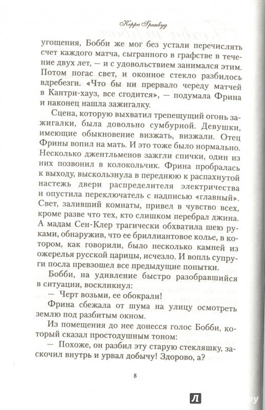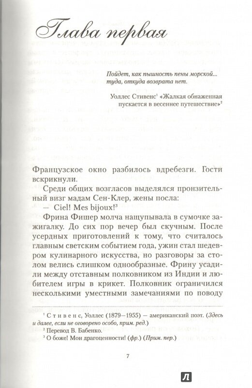 Я, как наверное и большинство читателей этой книги, сначала познакомилась с экранизацией серии романов про мисс Фишер. Сериал безумно понравился, и узнав, что он снят по книгам, сразу заказала парочку. Ну что могу сказать, внешний вид выше всяких похвал. Хорошая, яркая обложка, не деформируется при чтении. Белая бумага, хорошо пропечатанный шрифт, удобный для чтения. Но вот содержание разочаровало. Хотя, точнее будет сказать не само содержание (т.е. сюжет), а изложение. Не знаю, то ли это авторский текст такой, то ли перевод... Какой-то "деревянный" что ли... Постоянное "она", и сплошные глаголы: села, посмотрела, одела, съела и т.д. В любом случае, я считаю, что обязанность переводчика художественной литературы сделать текст именно "художественным", легко читаемым, все зависимости от оригинала. Русский язык такой богатый, куча синонимов, прилагательных, суффиксов и приставок. Любой, даже самый скучный и сухой текст можно преподнести как яркий, захватывающий фейерверк, не меняя его смысла.