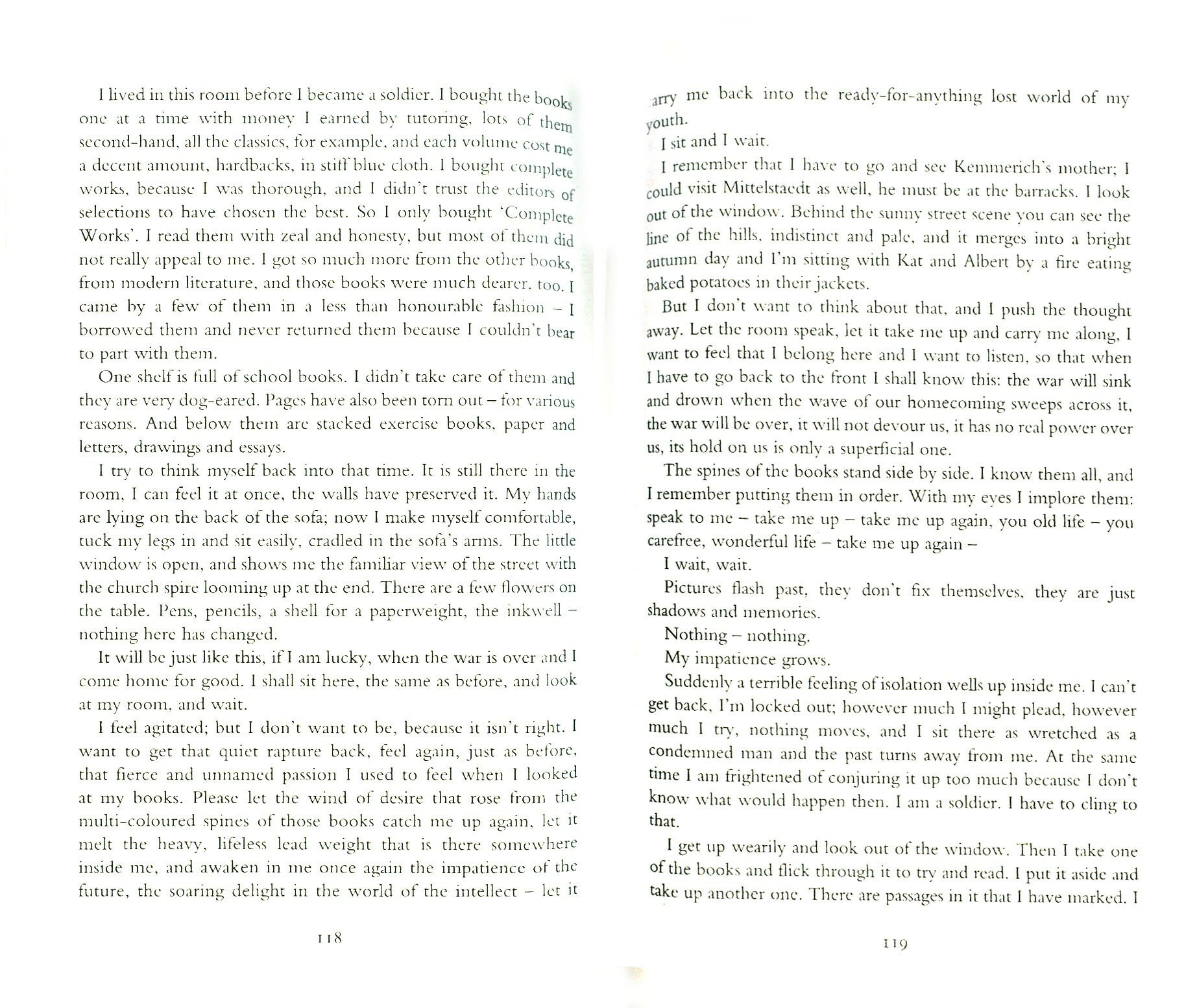 Этот роман о войне, о молодых солдатах на передовой. Еще вчерашние школьники сегодня сидят в окопах и давят вшей. Все ужасы войны очень хорошо прописаны. И бомбежки на кладбище, где пришлось прятаться на ряду с похороненными людьми, и доведенные до отчаяния новоприбывшие, бросающиеся под огонь лишь бы это все закончилось. Когда эти ребята прибыли на фронт оказалось, что реальность сильно отличается от того, что им внушала машина пропаганды. Оказалось, что, встретившись лицом к лицу с врагом он не монстр какой-нибудь, а такой молодой человек, как и ты, которому тоже «рассказали» почему ты враг и достоин смерти.