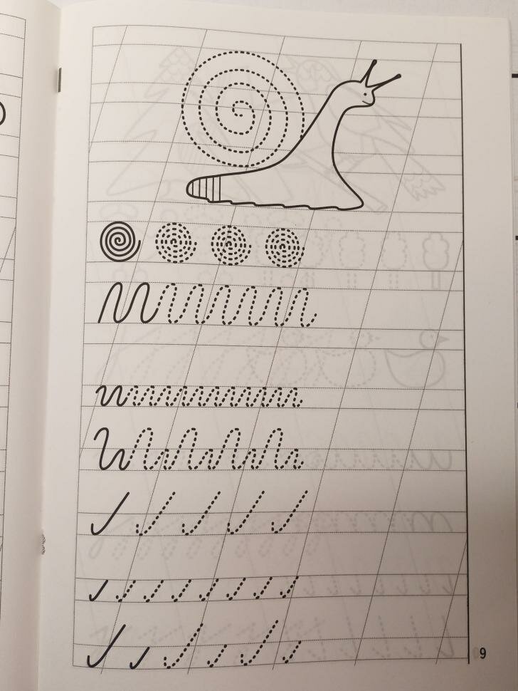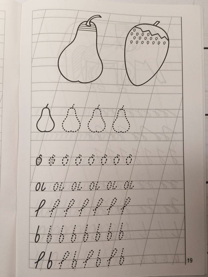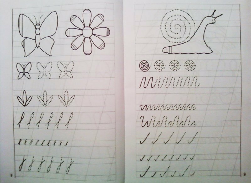 Очень хорошая тетрадь для занятий с ребенком соответствующего возраста. В ней задания для моторики руки: фигуры, рисунки пунктиром, линии. Далее элементы букв и сами буквы, причем в узкой линейке. Ребенок сразу же привыкает писать правильно и с наклоном буквы прописные и заглавные, вырабатывает свой почерк.