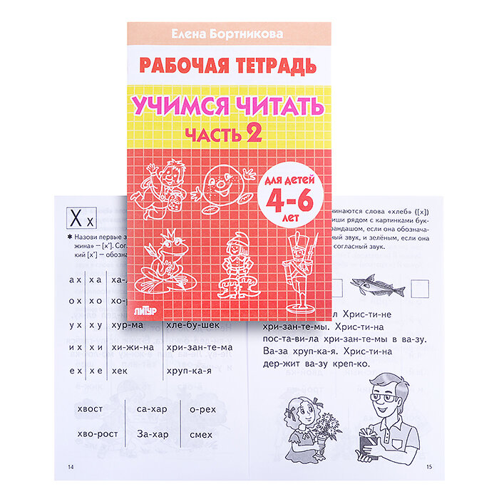 Учимся читать легко и быстро с Еленой Бортниковой. Две тетради. Приступая к работе со второй частью, ребёнок уже овладел навыком чтения и продолжает знакомство с оставшимися буквами. Последовательность заданий не меняется, но слова и тексты становятся более сложными. Листы белые, слегка просвечивают, чёрно-белые картинки. Ребёнок по тетрадке может заниматься сам, либо под контролем взрослого. На каждую букву есть характеристика звука.