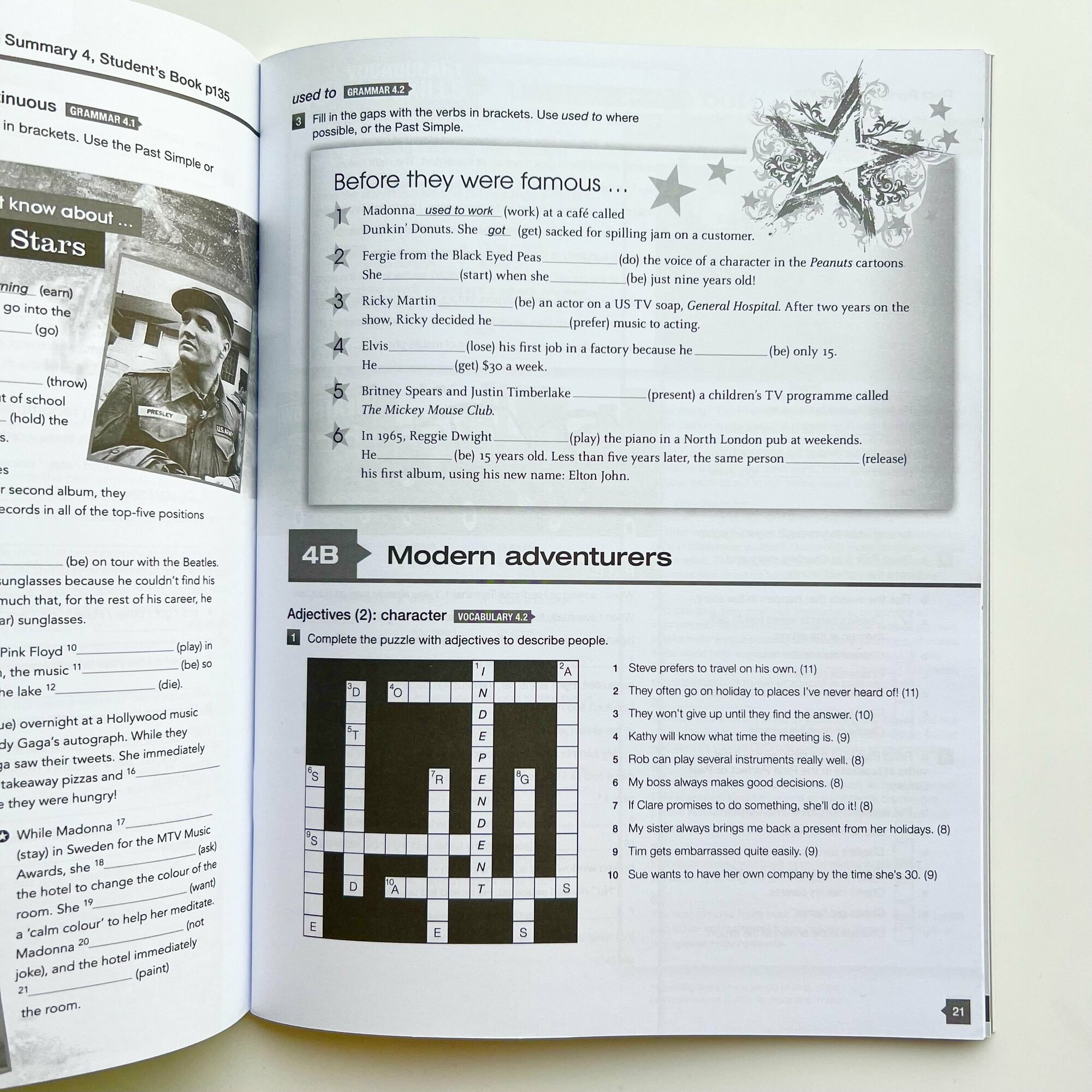 Рабочая тетрадь включает в себя возможность отработать пройденный в учебнике материал, а также дополнительные материалы, расположенные на 24 страницах Reading and Writing Portfolio, основанных на языковых компетенциях шкалы CEFR. Эта часть состоит из 12 двухстраничных уроков, которые созданы для работы дома или в классе, темы и содержание этих уроков привязаны к требованиям CEFR по чтению и письму. Каждый юнит включает в себя 4 урока на отработку лексики, грамматики, чтения и письма. Рабочая тетрадь содержит материалы для студентов, которым требуется дополнительное объяснение и отработка, чтобы не отставать от других учеников. Данная рабочая тетрадь содержит ответы к упражнениям.
