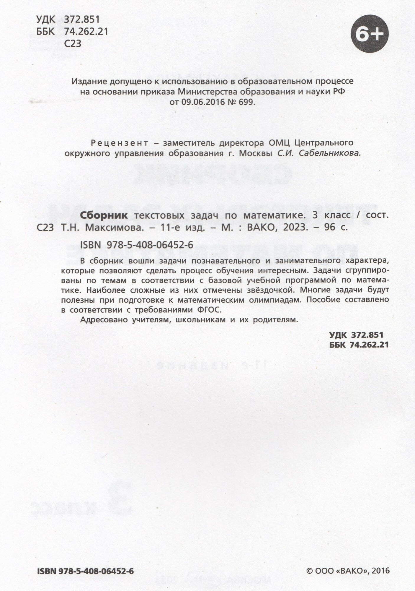 Сборник задач, заданий. ФГОС. Сборник текстовых задач по математике 3 класс. Максимова Т. Н. Сборник задач, заданий. ФГОС. Сборник текстовых задач по математике 3 класс. Максимова Т. Н. В сборник вошли задачи познавательного и занимательного характера, которые позволяют сделать процесс обучения интересным. Задачи сгруппированы по темам в соответствии с базовой учебной программой по математике. Наиболее сложные из них отмечены звёздочкой. Многие задачи будут полезны при подготовке к математическим олимпиадам. Пособие составлено в соответствии с требованиями ФГОС. Адресовано учителям, школьникам и их родителям. (4052982)