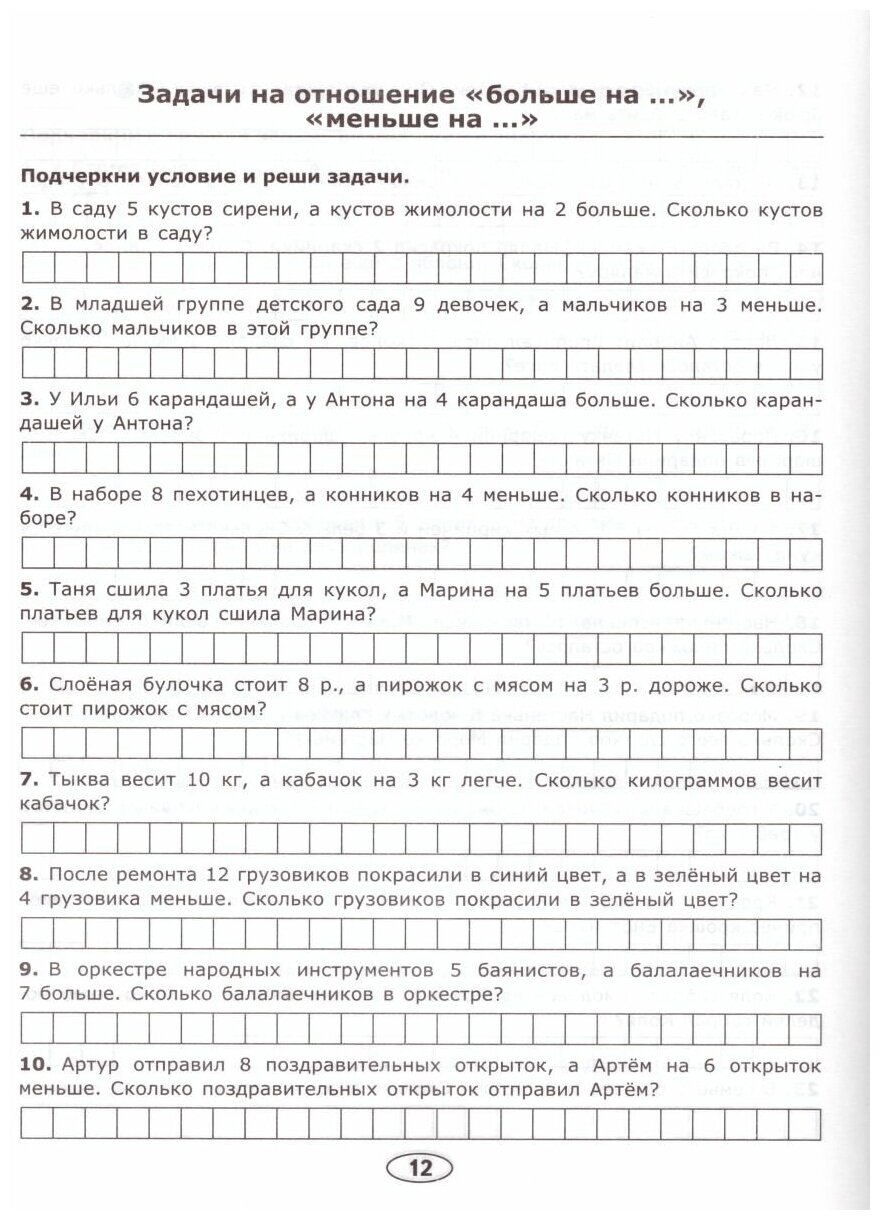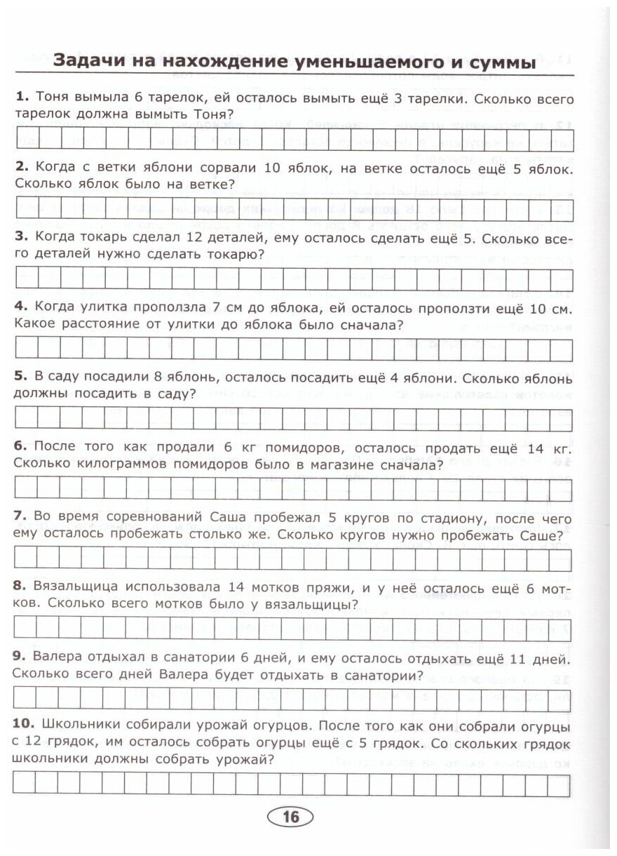 Сборник задач покупался в дополнение к сборнику того же автора с примерами по математике для первого класса. Задач много, но, на мой взгляд первые листы с картинками больше подходят для занятий по подготовке к школе, уж больно они простые и в общем-то уже не нужны первокласснику. Огорчило, что задачи составлены не по уровню сложности, как в задачнике с примерами. Приходится выбирать задачки по-сложнее. Есть разбивка на определенную тему например, на увеличение или на уменьшение. Жаль что нет задач, которые решаются в 2 действия. В целом порешать можно, но если бы я более внимательно просмотрела, наверное, купила бы другой.